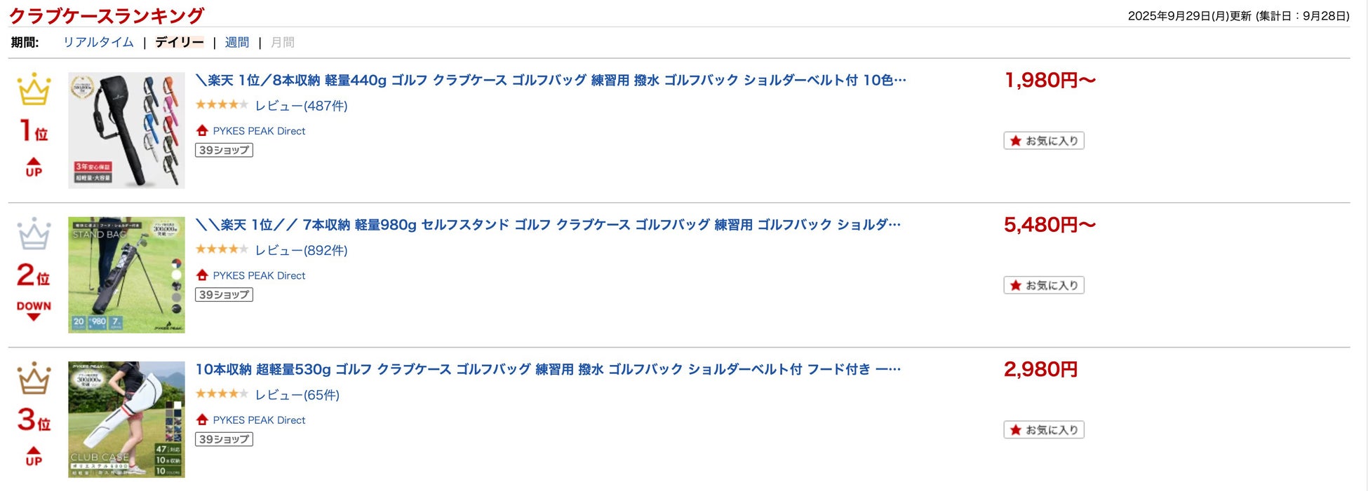 PYKES PEAK(パイクスピーク)が展開するゴルフクラブケースが、楽天市場デイリーランキング(クラブケース部門)において、1位から3位までを独占しました。(集計日:2025年9月28日)