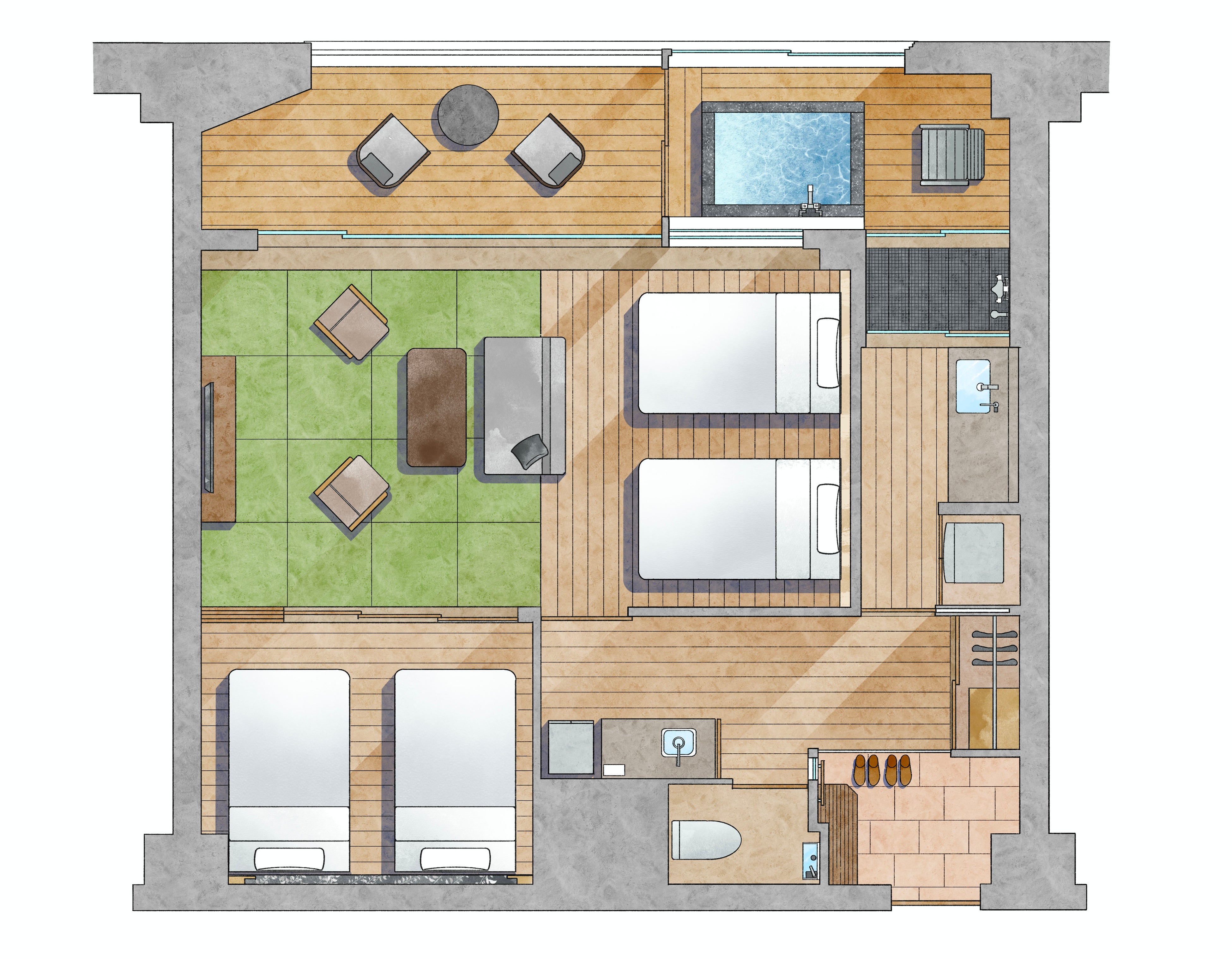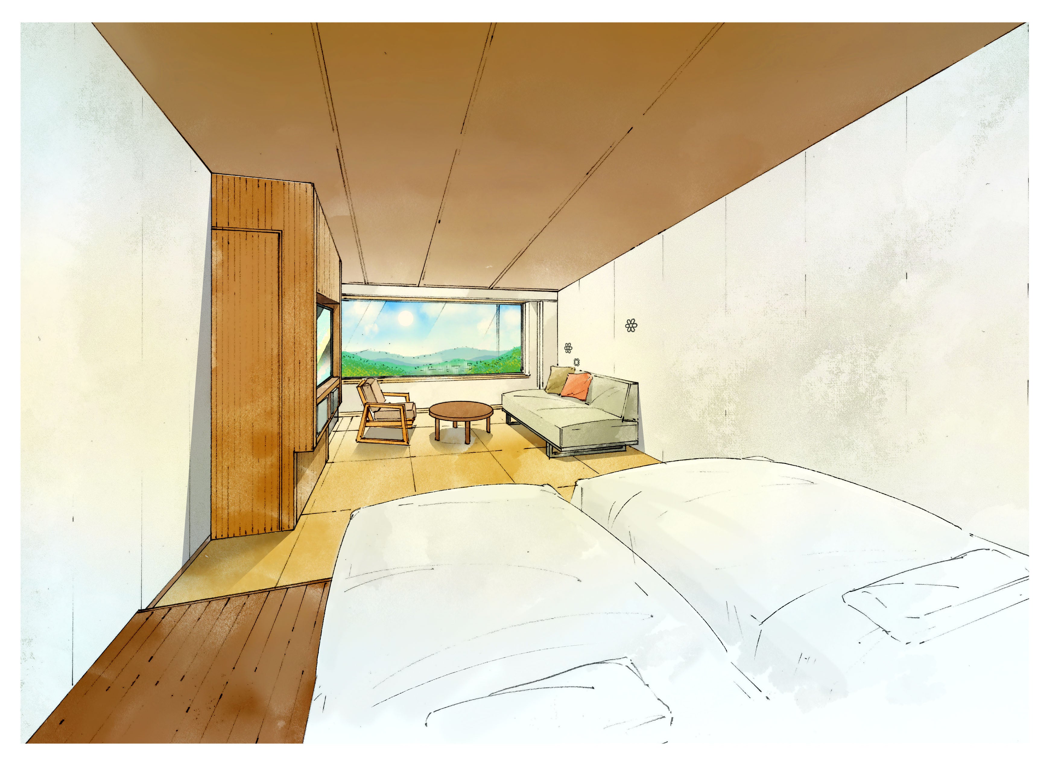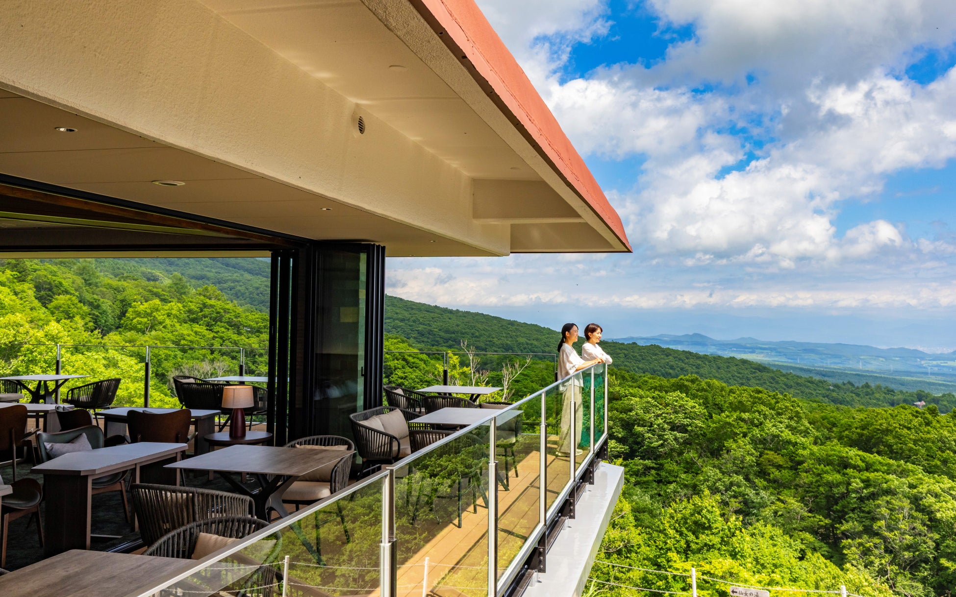 東館・最上階の3階に広さ68㎡、4ベッドの特別和洋室が2部屋誕生。彼方に盛岡の街影や眼下に小岩井農場の森のパノラマが広がります。テラスや半露天はさながら早池峰山から昇るご来光の指定席で、その趣はまさに“サンライズスイートSunrise Suite”。室内にはミニキッチン、洗濯乾燥機を完備しており、長期滞在にもおすすめです。