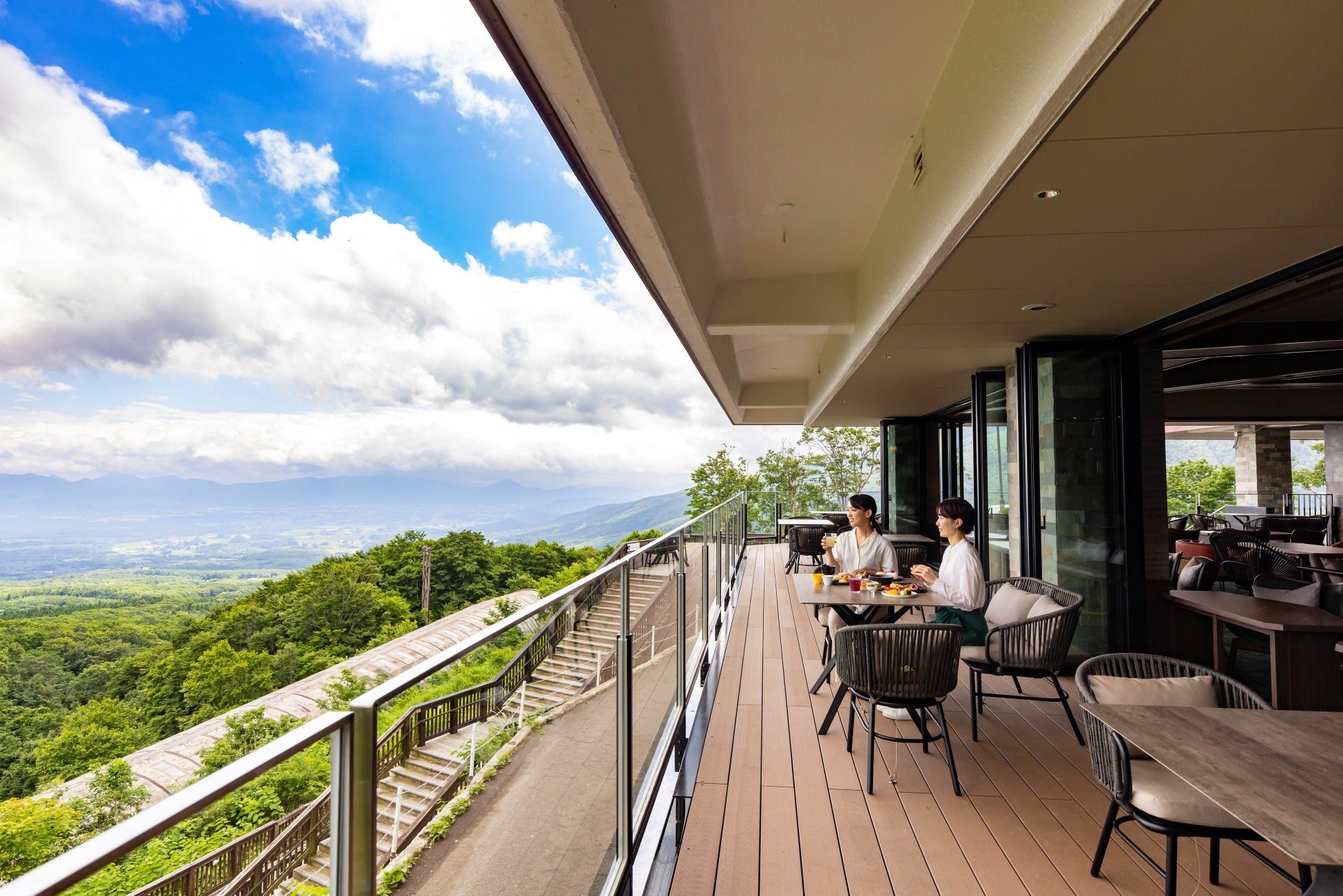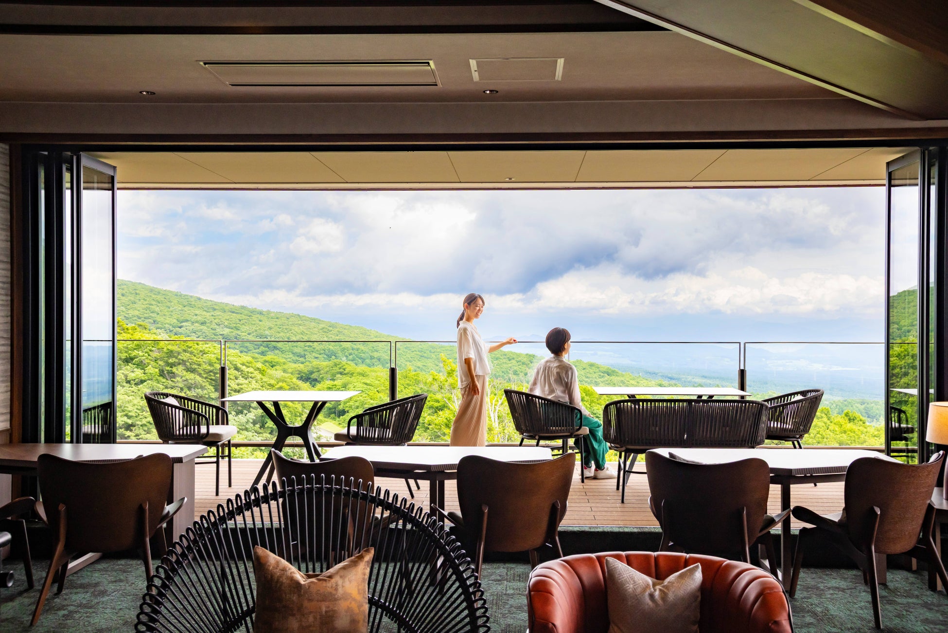 窓を全開放しテラスと一体となることで高原の爽やかさと開放感を満喫できます。