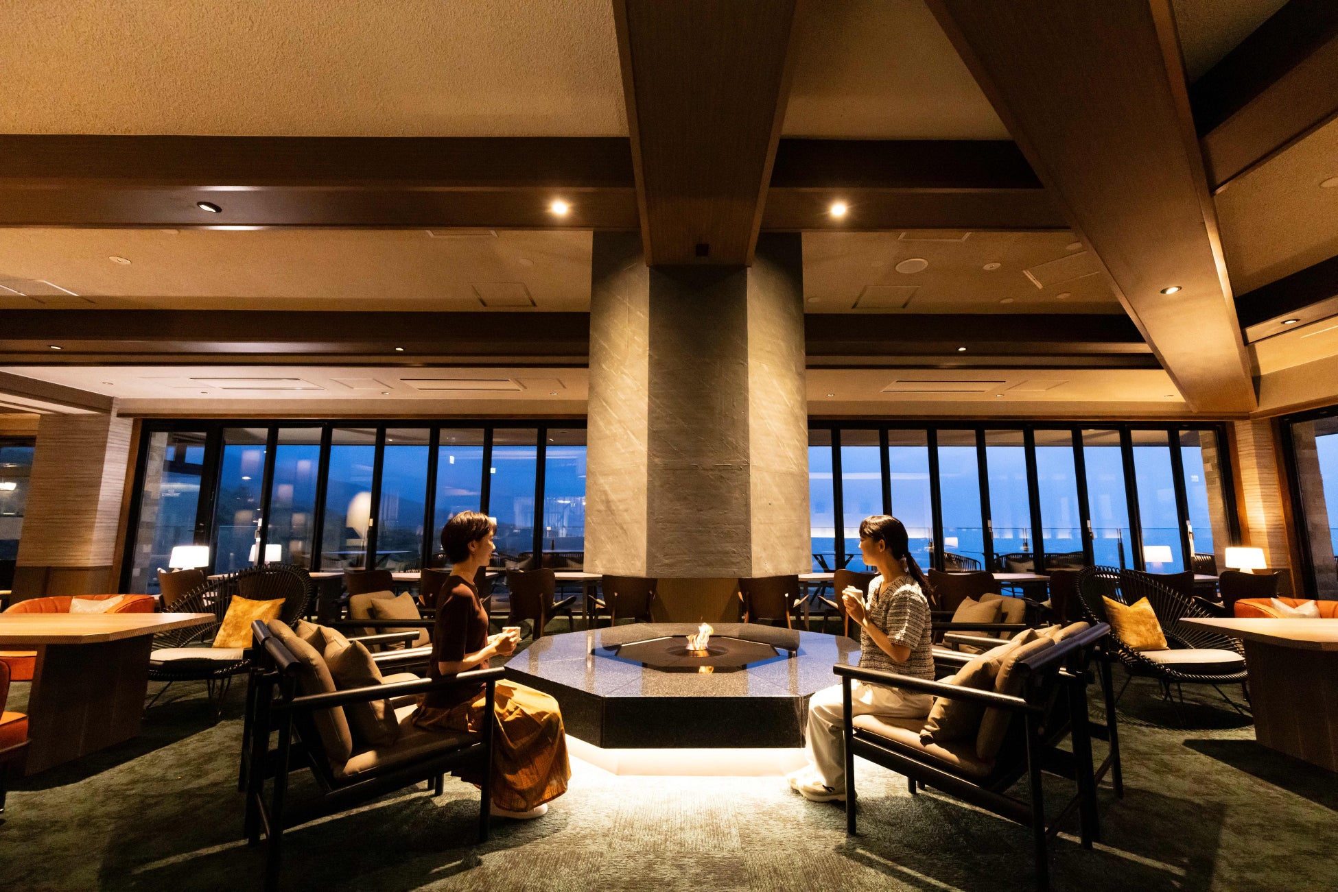 昼はカフェ、朝夕はダイニングになるマルチラウンジ。中央の暖炉とそれを囲むソファー、パノラマを望むように配置されたテーブル、南部鉄器や漆器などの工芸品のしつらえが、非日常でありながら我が家に帰ったような、それぞれの旅人の寛ぎを演出します。