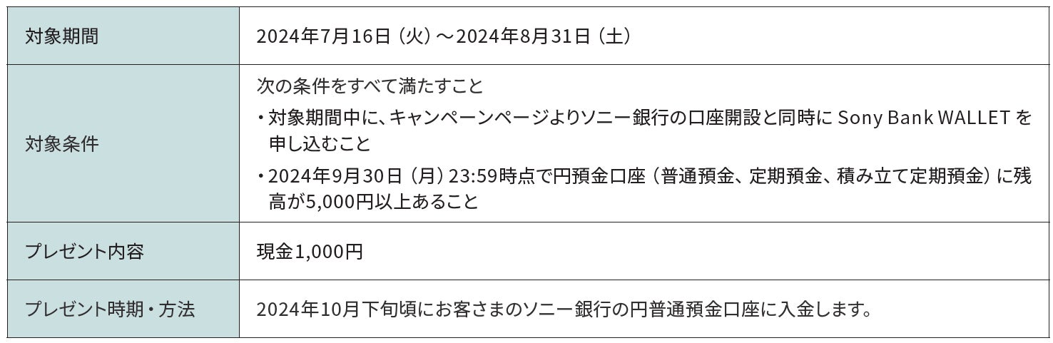 ソニー銀行株式会社(代表取締役社長:南 啓二/本社:東京都千代田区/以下 ソニー銀行)は、2024年7月16日(火)より、「口座開設とご入金でもれなく現金プレゼント」キャンペーンを実施しますので、お知らせします。