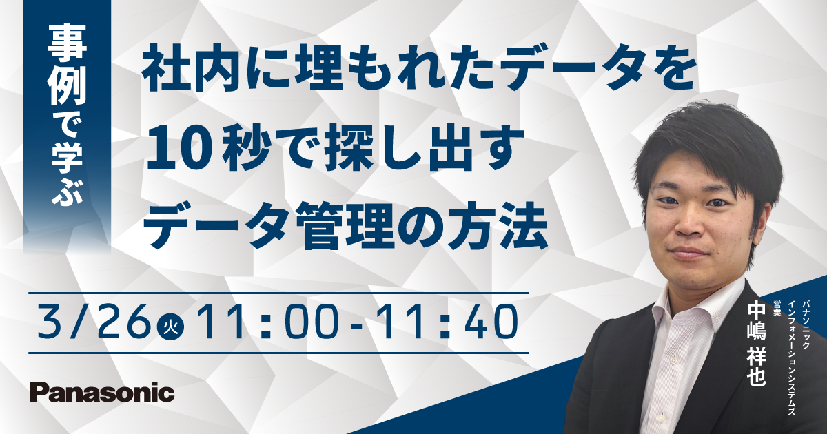 パナソニック インフォメーションシステムズ株式会社は、2024年3月26日(火)『事例で学ぶ 社内に埋もれたデータを10秒で探し出すデータ管理の方法』セミナーを開催します。