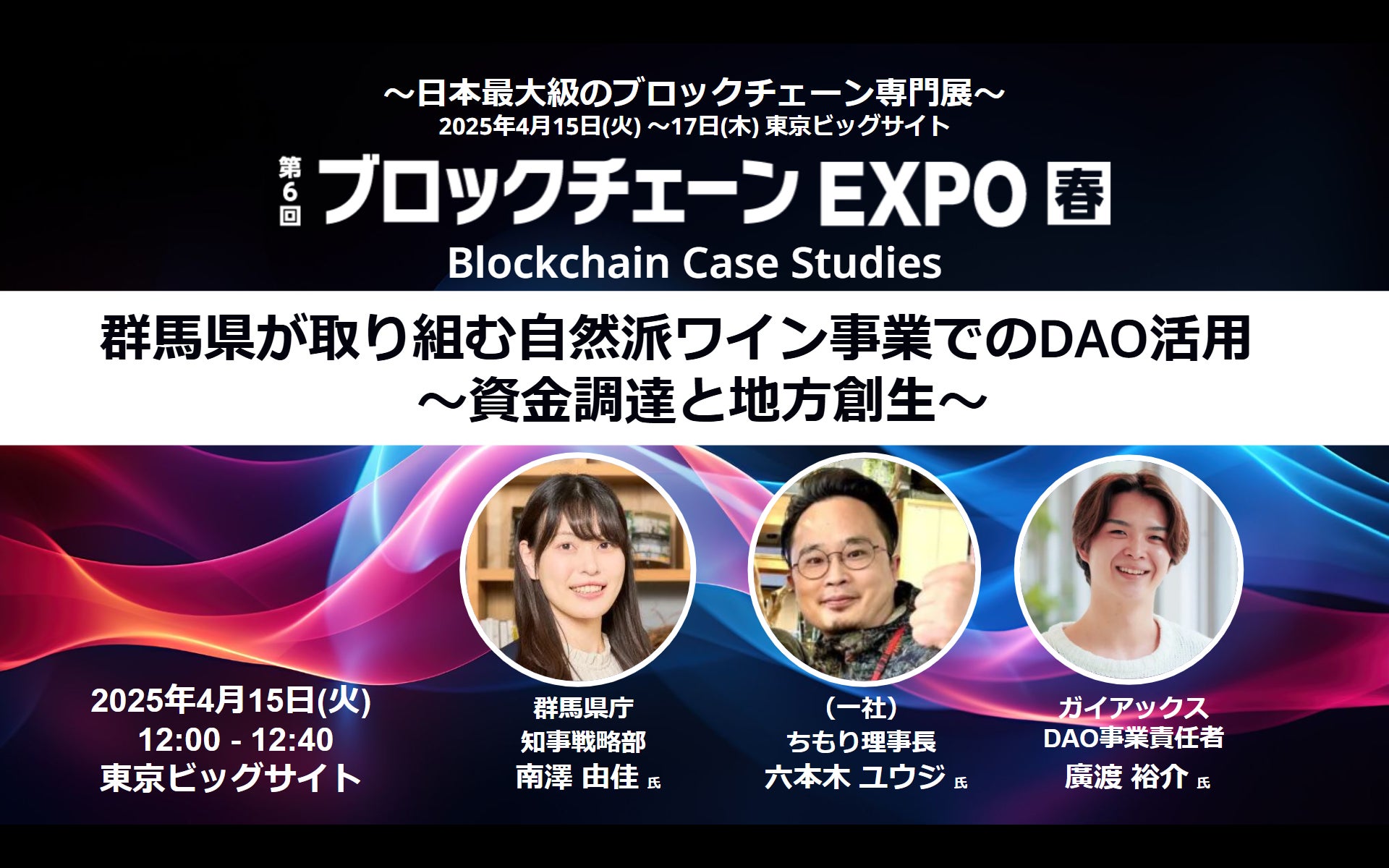 セッションタイトルは「群馬県が取り組む自然派ワイン事業でのDAO活用 ~資金調達と地方創生~」。一般社団法人ちもり理事長 六本木ユウジ氏、群馬県庁 知事戦略部 デジタルトランスフォーメーション課 NETSUGEN運用チーム主事 南澤由佳氏、株式会社ガイアックスDAO事業責任者の廣渡裕介が2025年に発足した「ぐんま山育DAO」を事例に、DAO活用による資金調達と地方創生の最前線をお届けします。
