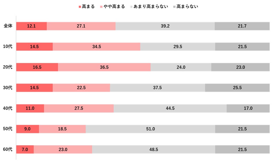 国内の観光業界に二重価格が設定された場合、国内旅行をする意識は高まるか聴取した。全体では「高まる」(12.1%)、「やや高まる」(27.1%)を合わせた「高まる派」は39.2%だった。年代別では10代と20代の約半数が「高まる派」となり、若年層の旅行意向にプラスの影響を及ぼすことが確認された。