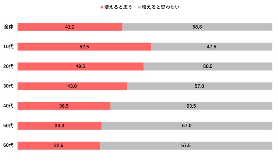 また、国内旅行をする機会や選択肢が増えるかについても、年代が低いほど「増えると思う」が高く、10代では52.5%だった。