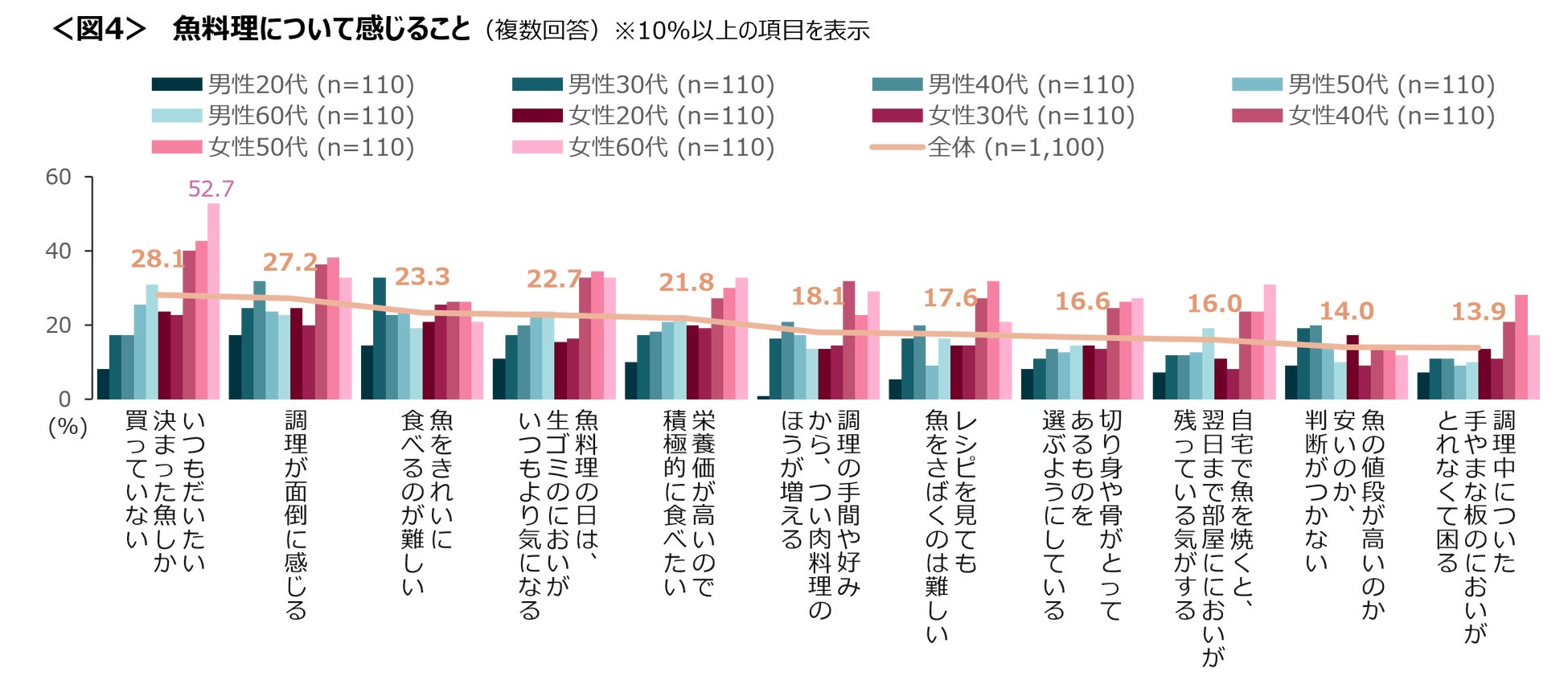 「いつもだいたい決まった魚しか買っていない」は女性60代で5割を超え、定番のものに偏る傾向がみられる。また女性40~60代は全体的に高い項目が多く、特に調理の手間や、魚のにおいを気にしている。<図4>