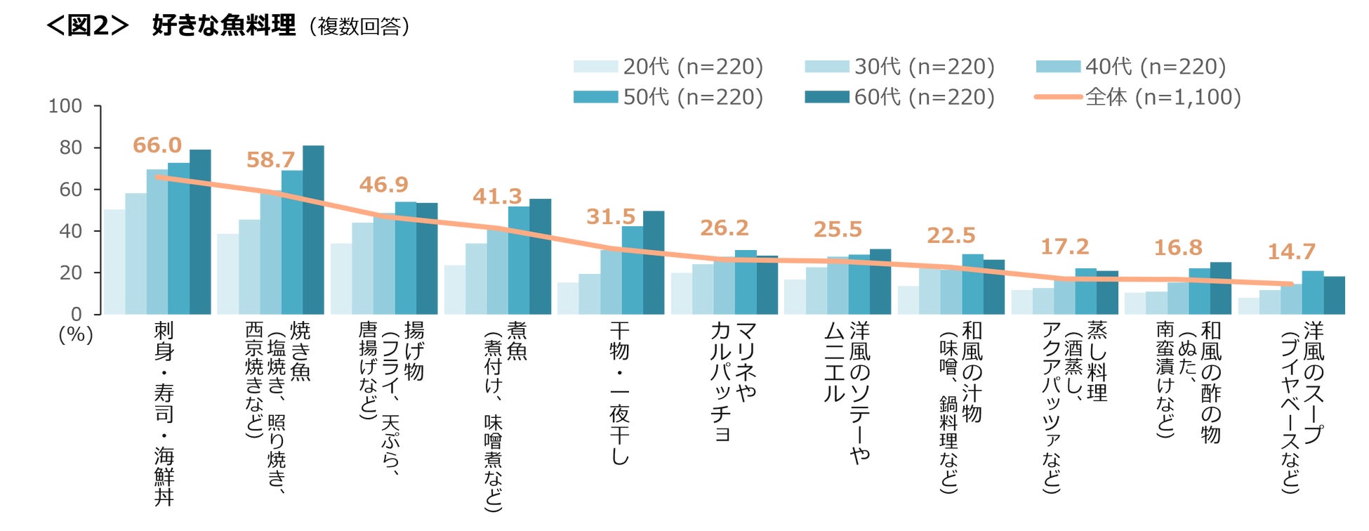 年代が上がるほど、和食系の魚料理の支持率は高い傾向。<図2>