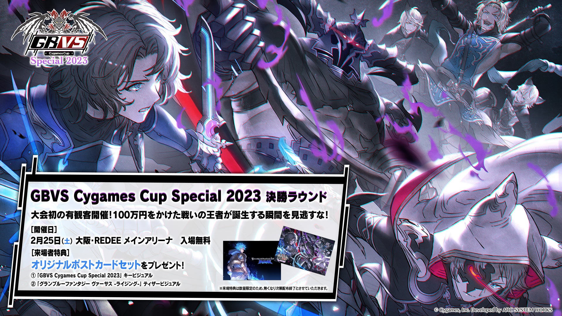 ゲームの企画・開発・運営事業を展開する株式会社Cygames(以下、サイゲームス 本社:東京都渋谷区、代表取締役社長:渡邊耕一)は、自社で企画・制作し、アークシステムワークス株式会社が開発を行うPlayStation®4 / Steam® 向け対戦アクションRPG『グランブルーファンタジー ヴァーサス』の公式大会「GBVS Cygames Cup Special 2023」に関して、2023年2月25日(土) にREDEE(大阪府吹田市)で開催される決勝ラウンドの進出者ならびに来場者特典情報をお知らせします。