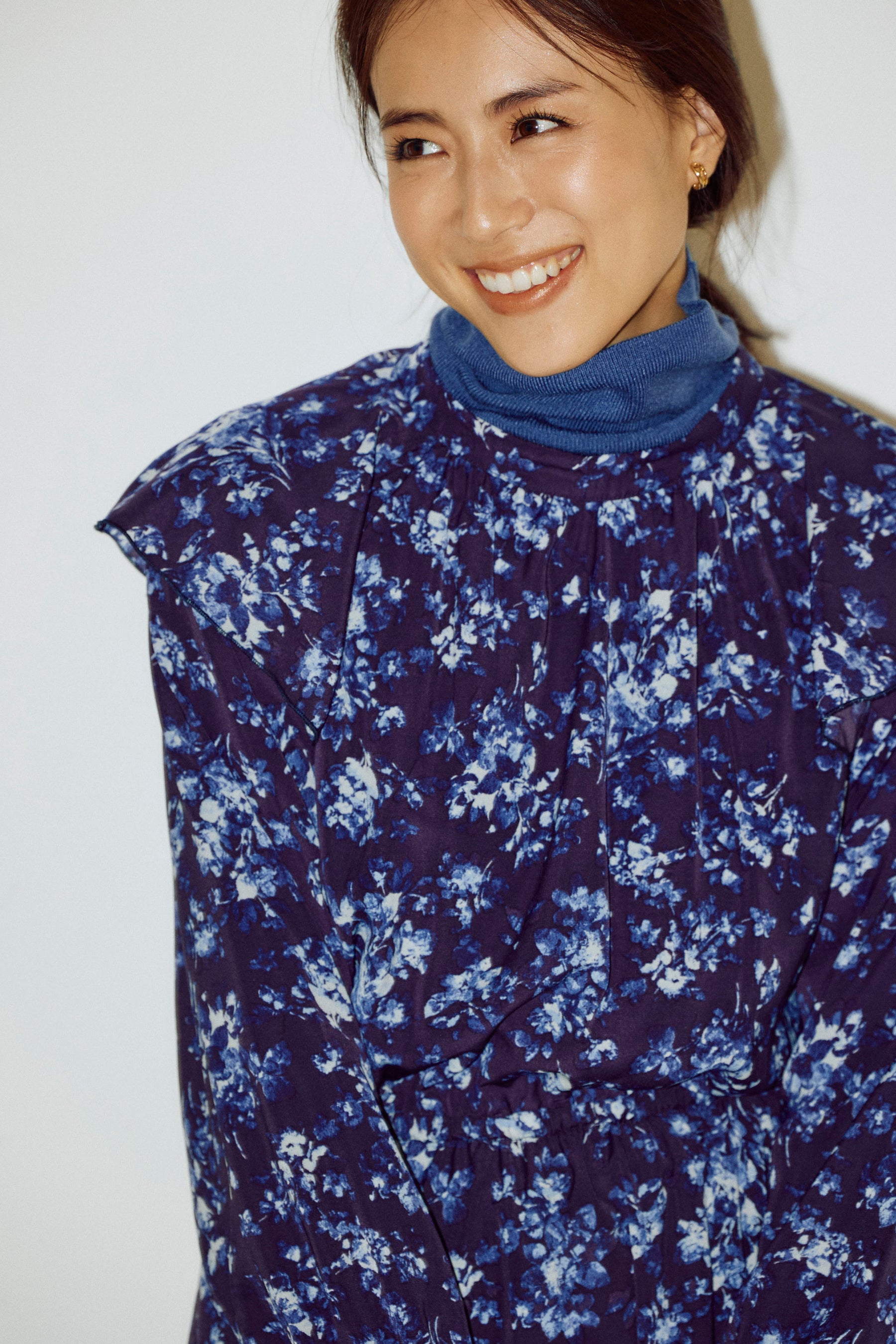 深いネイビーをベースにフラワープリントもブルー系のワントーンでまとめることで、シックで大人っぽい雰囲気に。抽象プリントなのも相まって、花柄がたちすぎないので気負わずに、誰でも似合う万能性も魅力のひとつ。