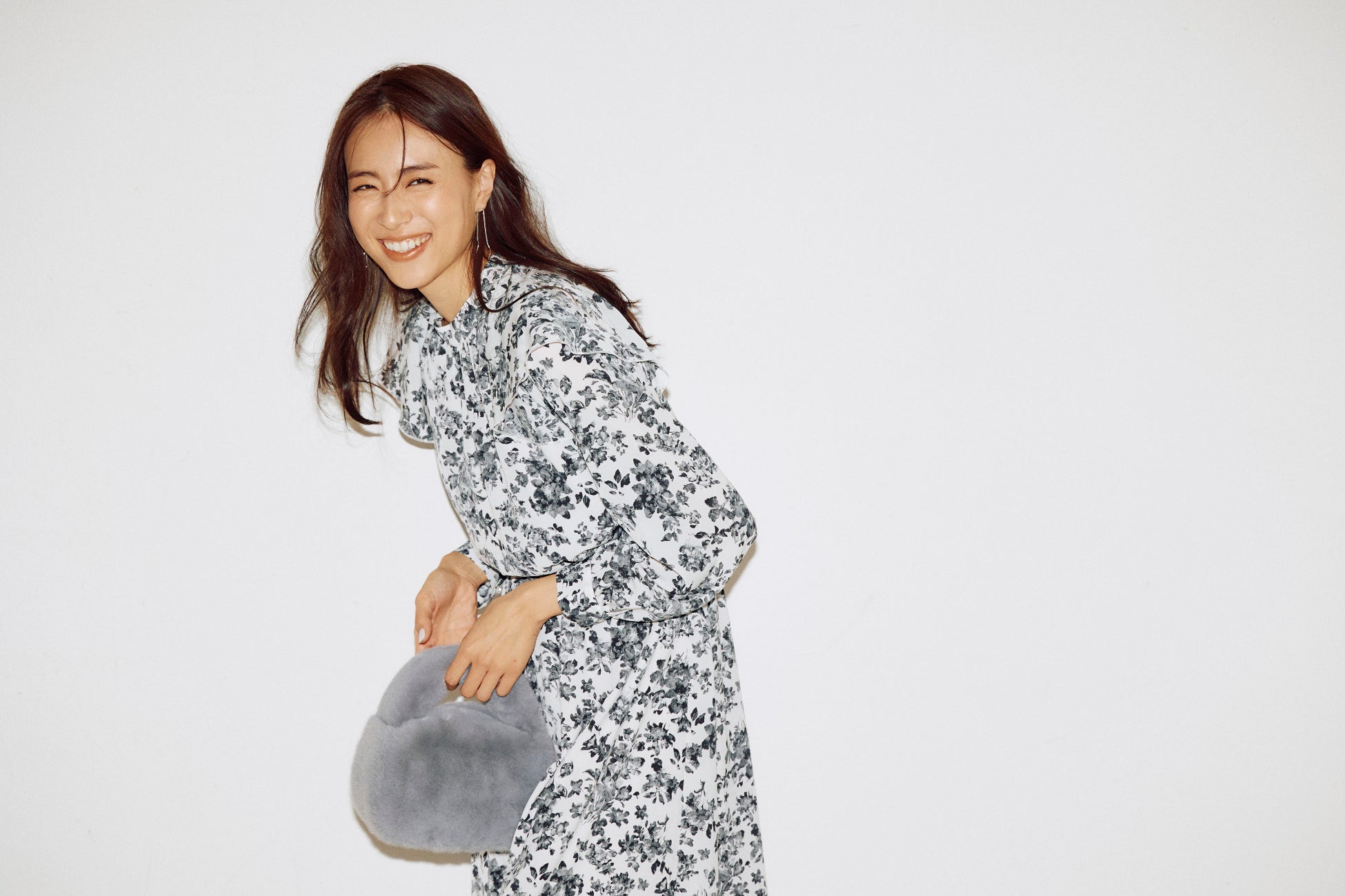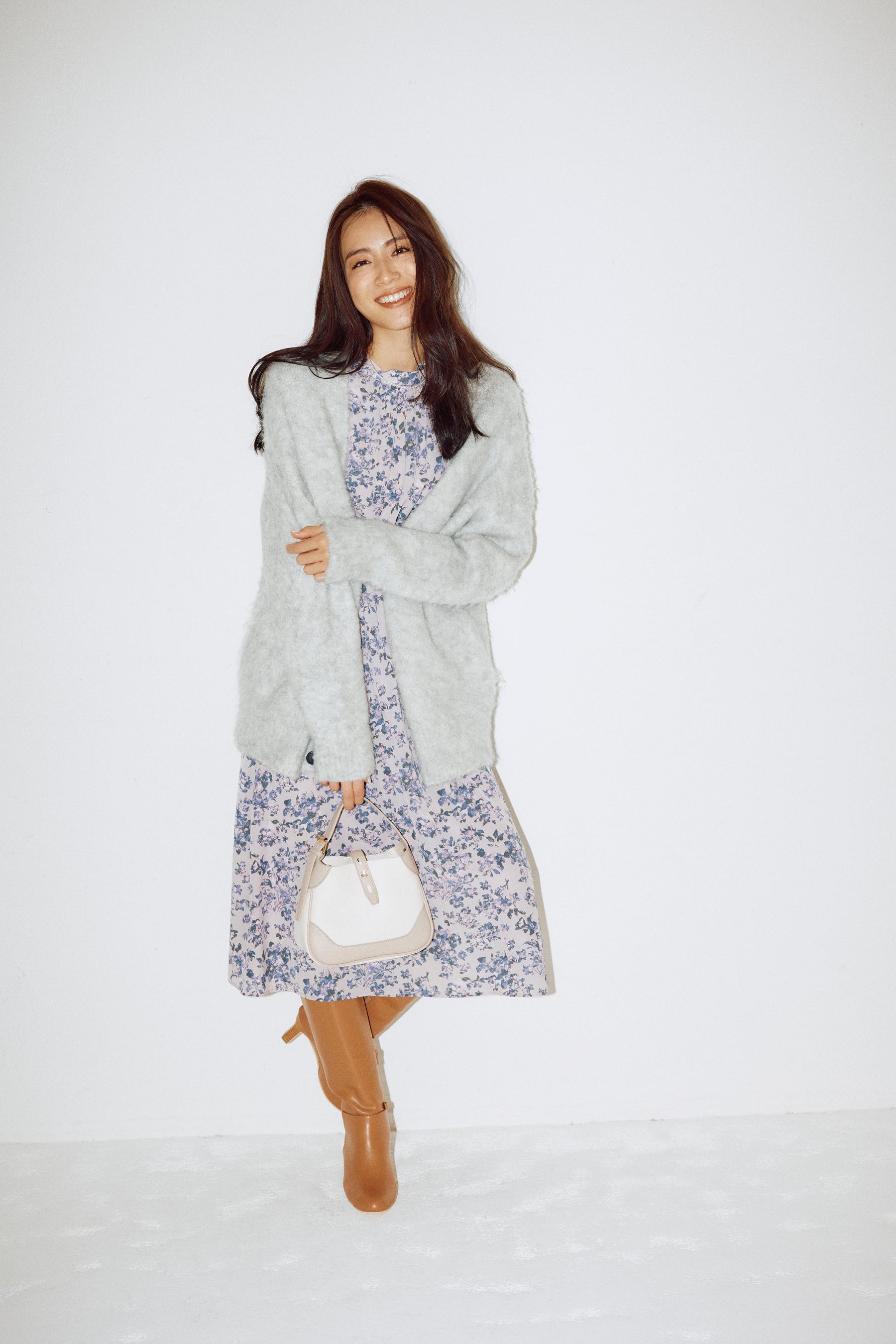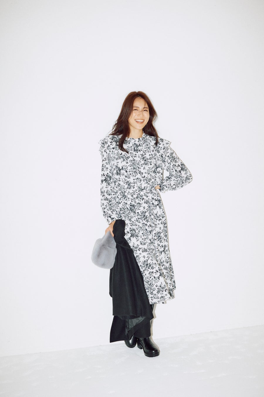 フリルとフラワープリントのスイート要素満載なワンピースも、全体的に散りばめられたモノトーンのプリント効果で、グレイッシュな印象が強まり、甘さを上手に引き算。華やかだけど、洗練された、大人の甘さがちょうどいい一枚に。