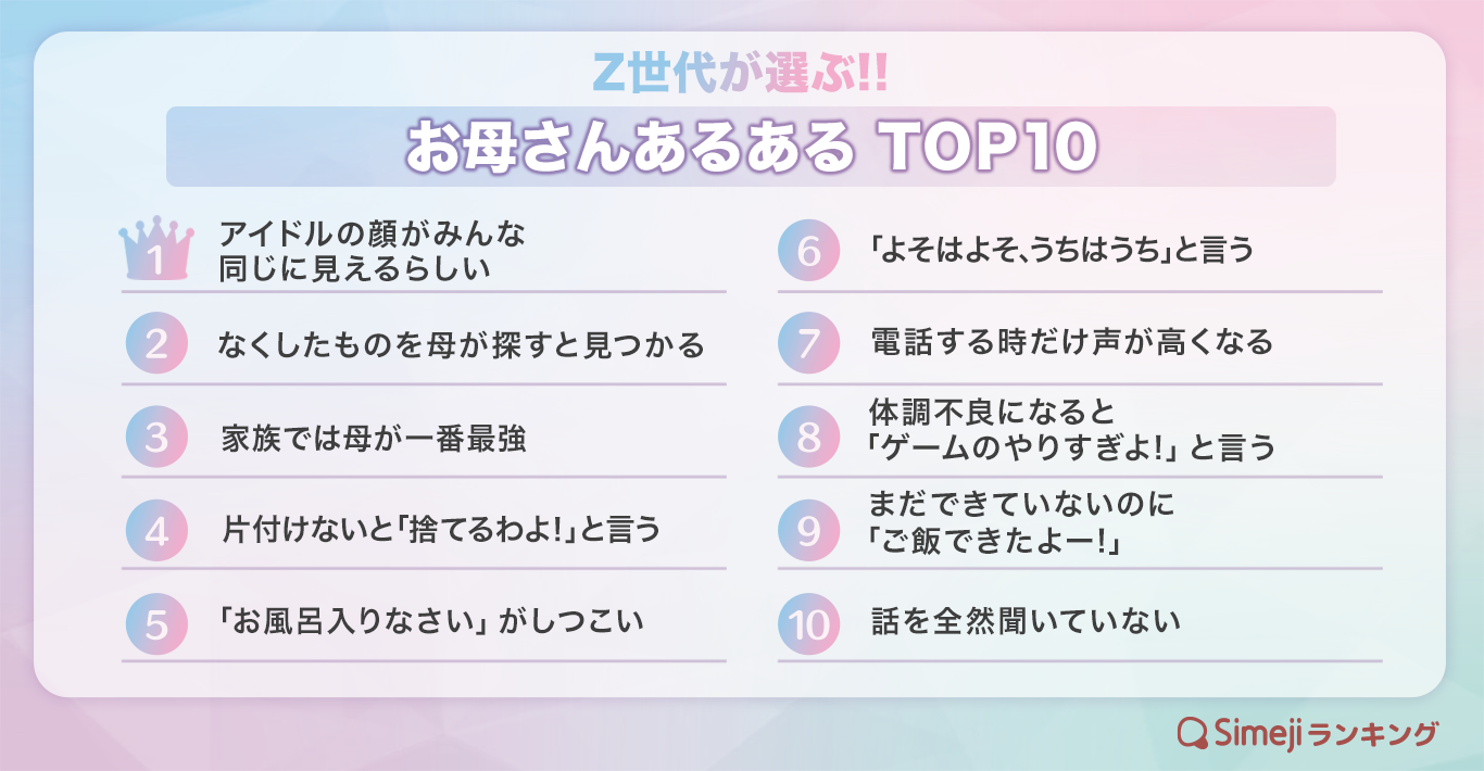 【Simejiランキング】Z世代が選ぶ!!「お母さんあるあるTOP10」