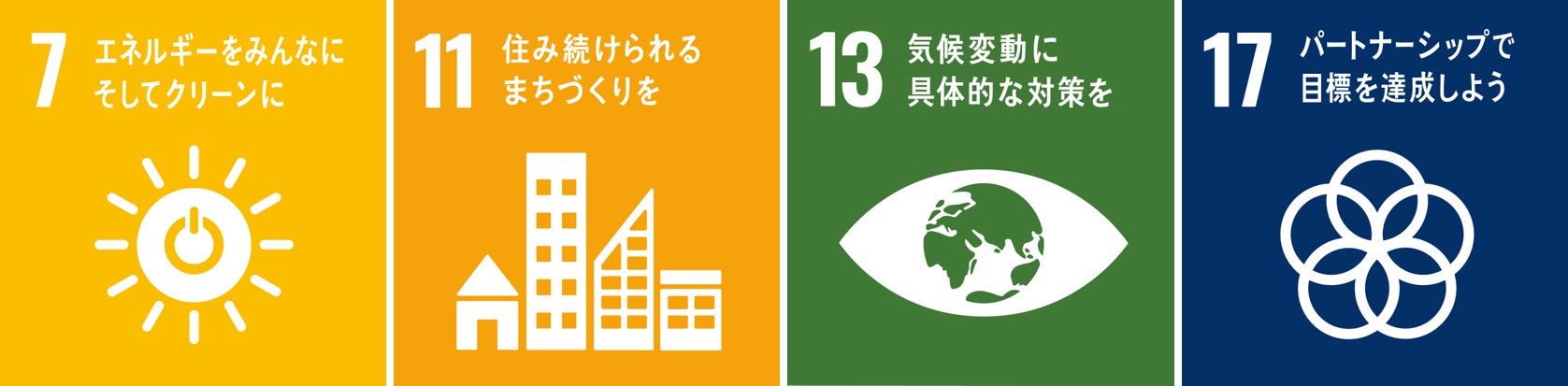 今回の取組は、SDGsの17のゴールのうち、特に7番、11番、13番、17番に貢献するものと考えております。