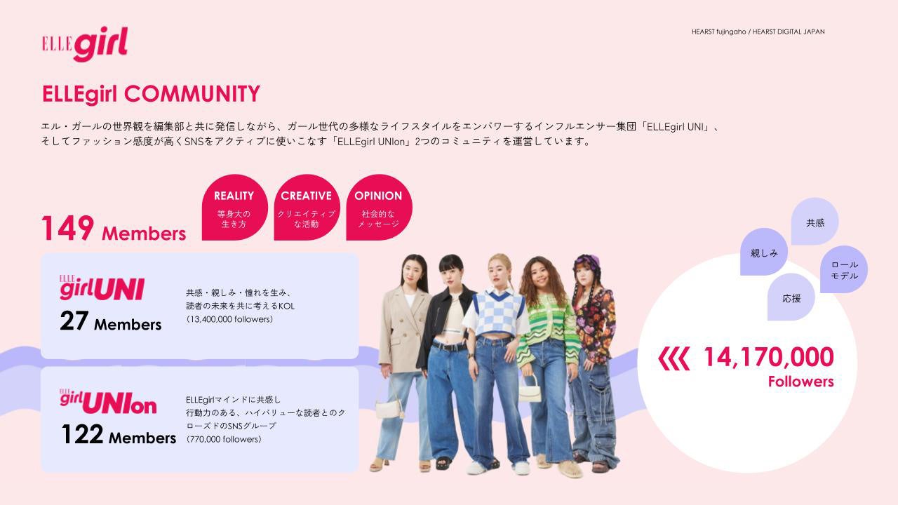 2009年にはブログエディターとしてスター読者を発掘し、インフルエンサーによる等身大の情報発信を開始。2019年からは、「等身大の生き方」「クリエイティブな活動」「社会的なメッセージ」をキーワードに、共感・親しみ・憧れを生むKOL集団「ELLEgirl UNI」と、行動力のある読者グループ「ELLEgirl UNIon」の2つのコミュニティを運営しており、メンバーの総フォロワー数は1,400万を超えます(2024年8月15日現在)。