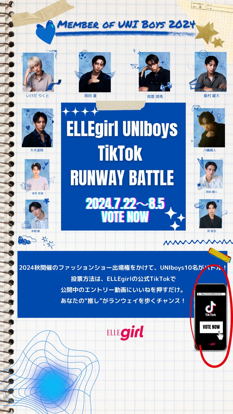多様性の時代、ステージを彩るのは女性だけではありません。「ELLEgirl UNI」内のメンズユニット、「UNIboys」によるマイナビ TGC 2024 A/W出演権をかけたオーディション企画を『ELLEgirl』公式TikTokで開催中です。出演動画のいいね数を合算値を得票数とし、上位3名がマイナビ TGC 2024 A/W出場権を獲得します。本日、2024年8月15日(木)20時から『ELLEgirl』公式Instagramと公式TikTokのライブ配信で結果を発表します。