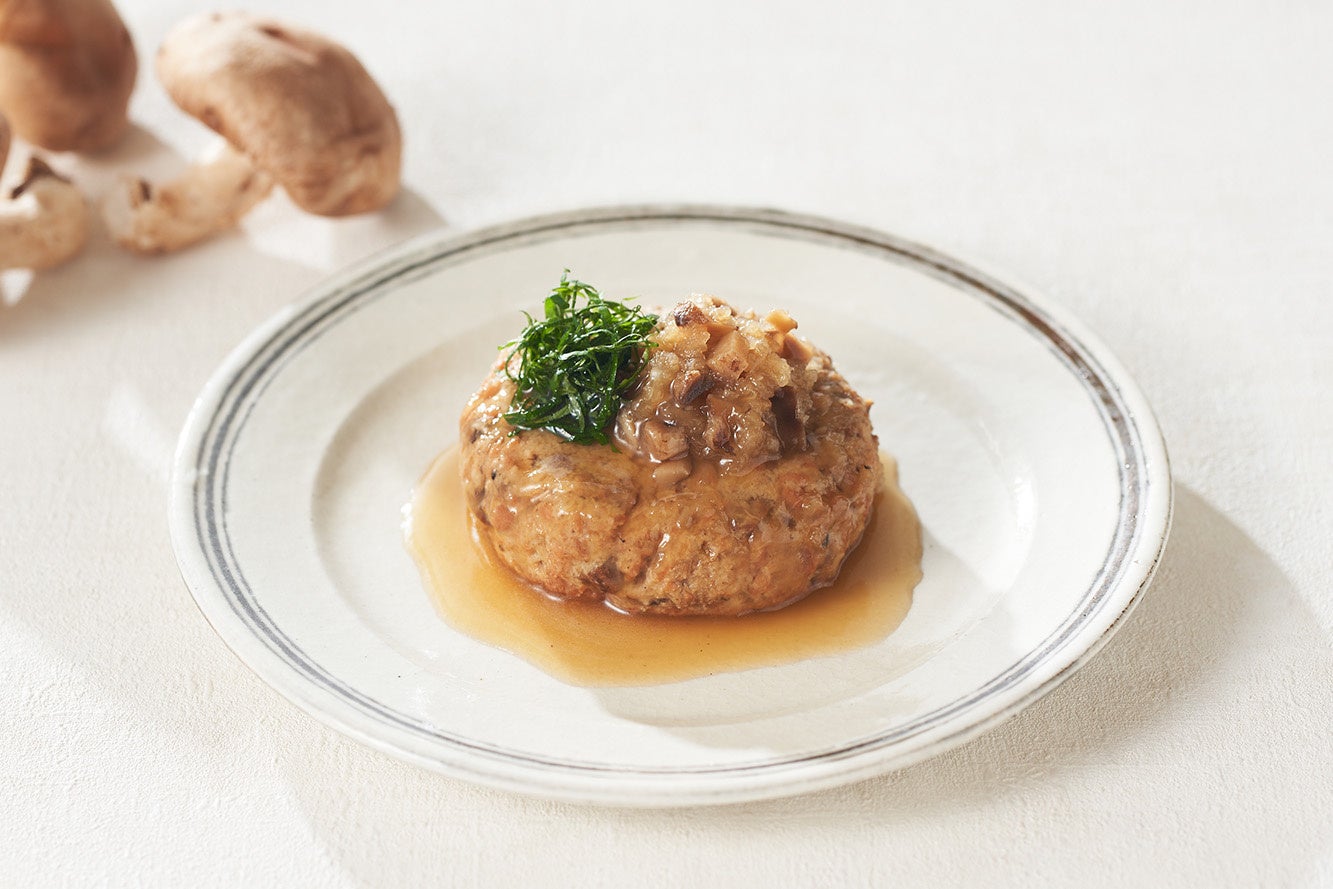 しいたけのカット工場で未活用だったしいたけの軸の食感と旨味を活かした和風味のハンバーグ。肉類不使用で、豆腐とおからを使いなめらかな口当たりに仕上げました。合わせダレにも、しいたけの軸を使い魚だしと合わせることでその旨味を存分に味わえます。