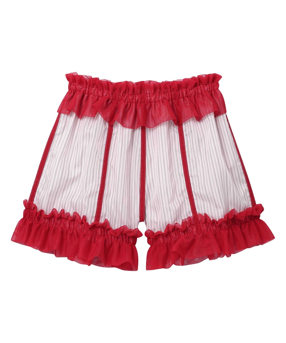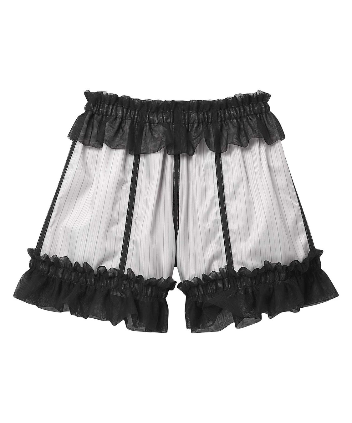 ドレスのインナーであるコルセットとメンズテーラードの裏地をイメージしたボトムに、「HOUGA」のアイコンである“フリル”をあしらった特別なデザイン。