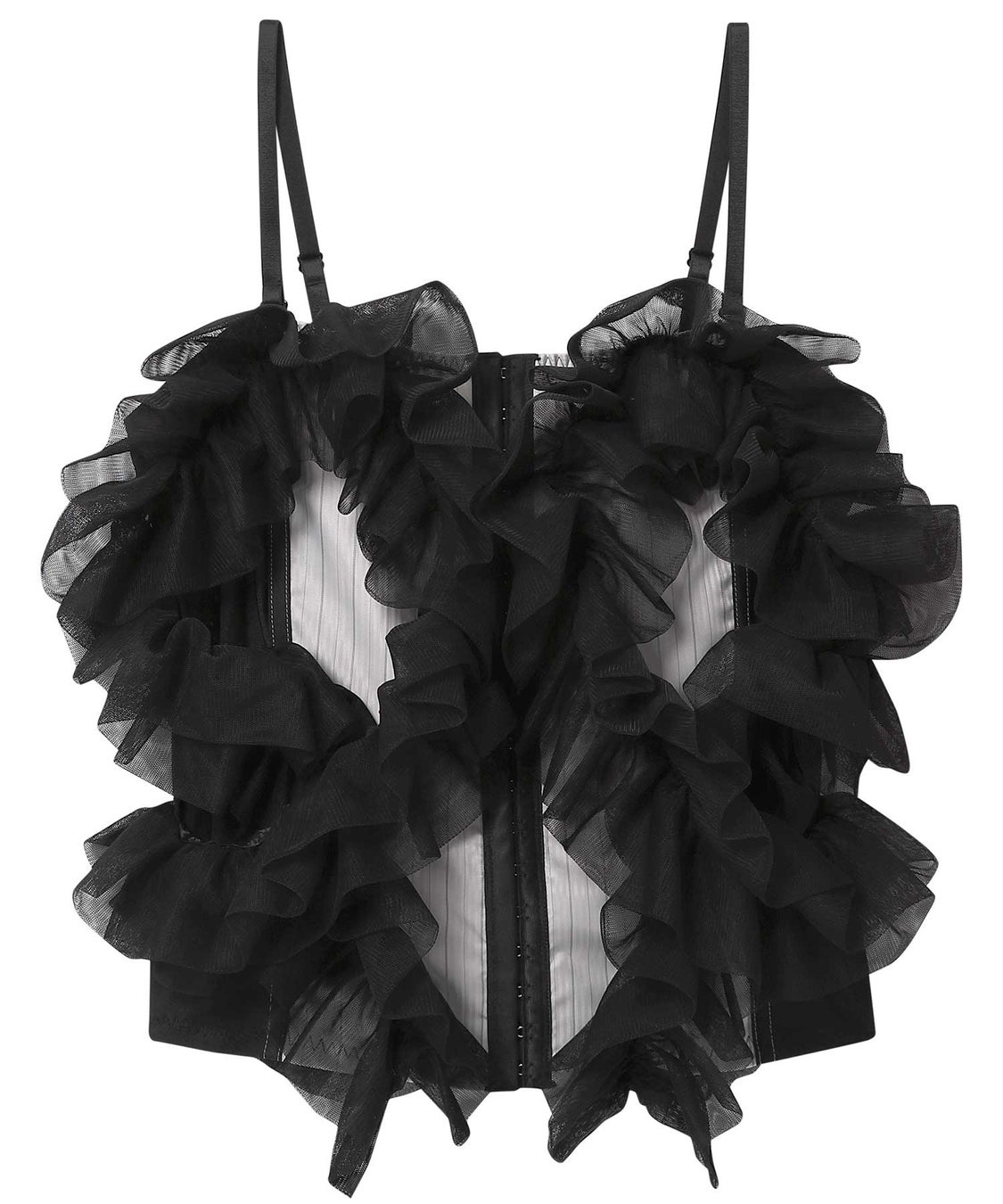 ●各アイテムには、「HOUGA」のアイコンであるフリルモチーフを大胆にあしらい、唯一無二のコレクションを完成させました。ドレスのインナーであるコルセットと、メンズテーラードの裏地をイメージし、コントラストのきいたトリムデザインがポイントです。