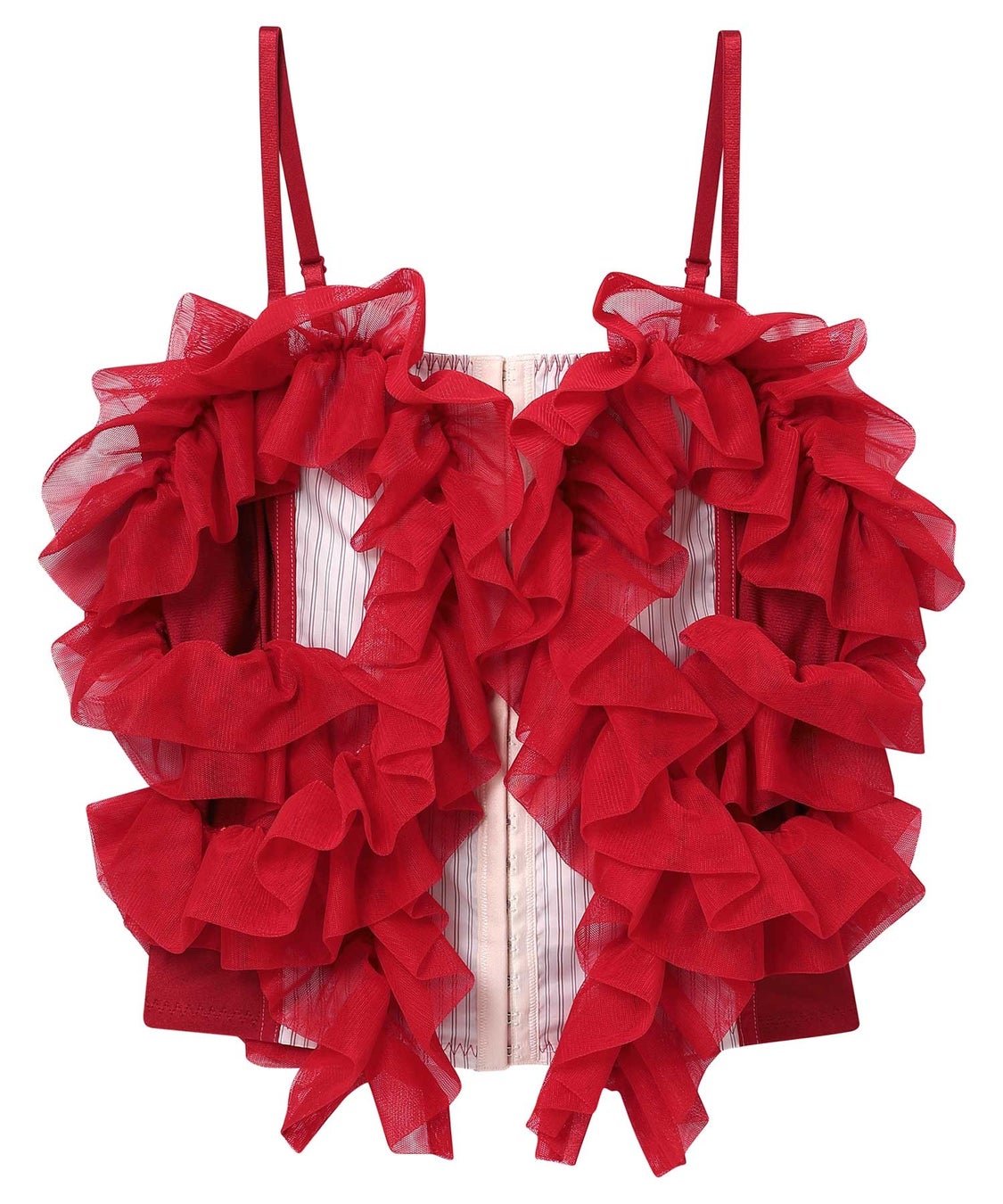 本コレクションは、「HOUGA」のコンセプトを表現し、HOUGAの世界観を下着に落とし込んだコラボならではのユニークなデザインが特徴です。ラッフルドトップス、ボトムの大胆にフリルを施したデザインは、ファッション性を高めるだけでなく、身につける人のこころとからだをきらめかせる力も秘めています。