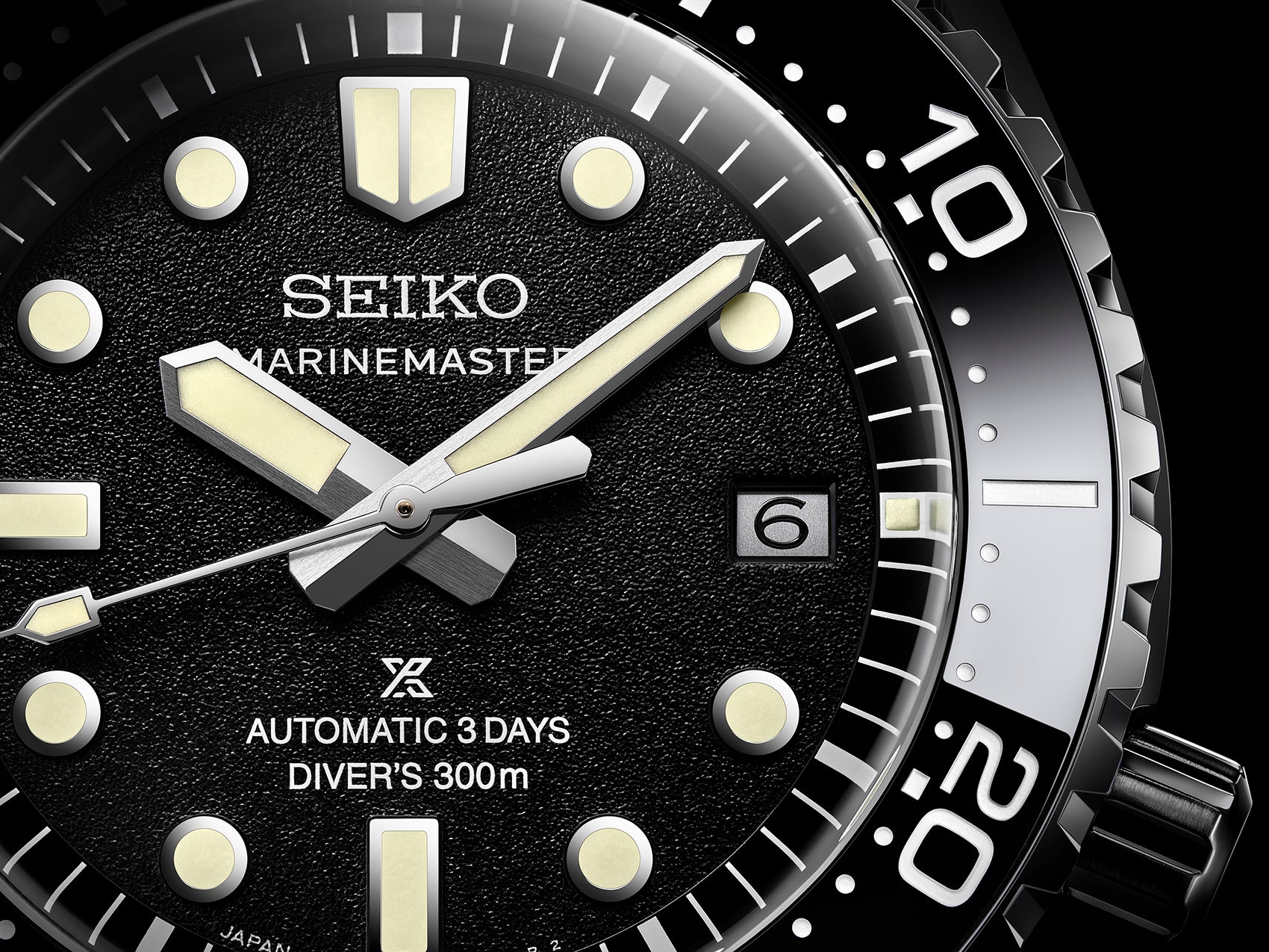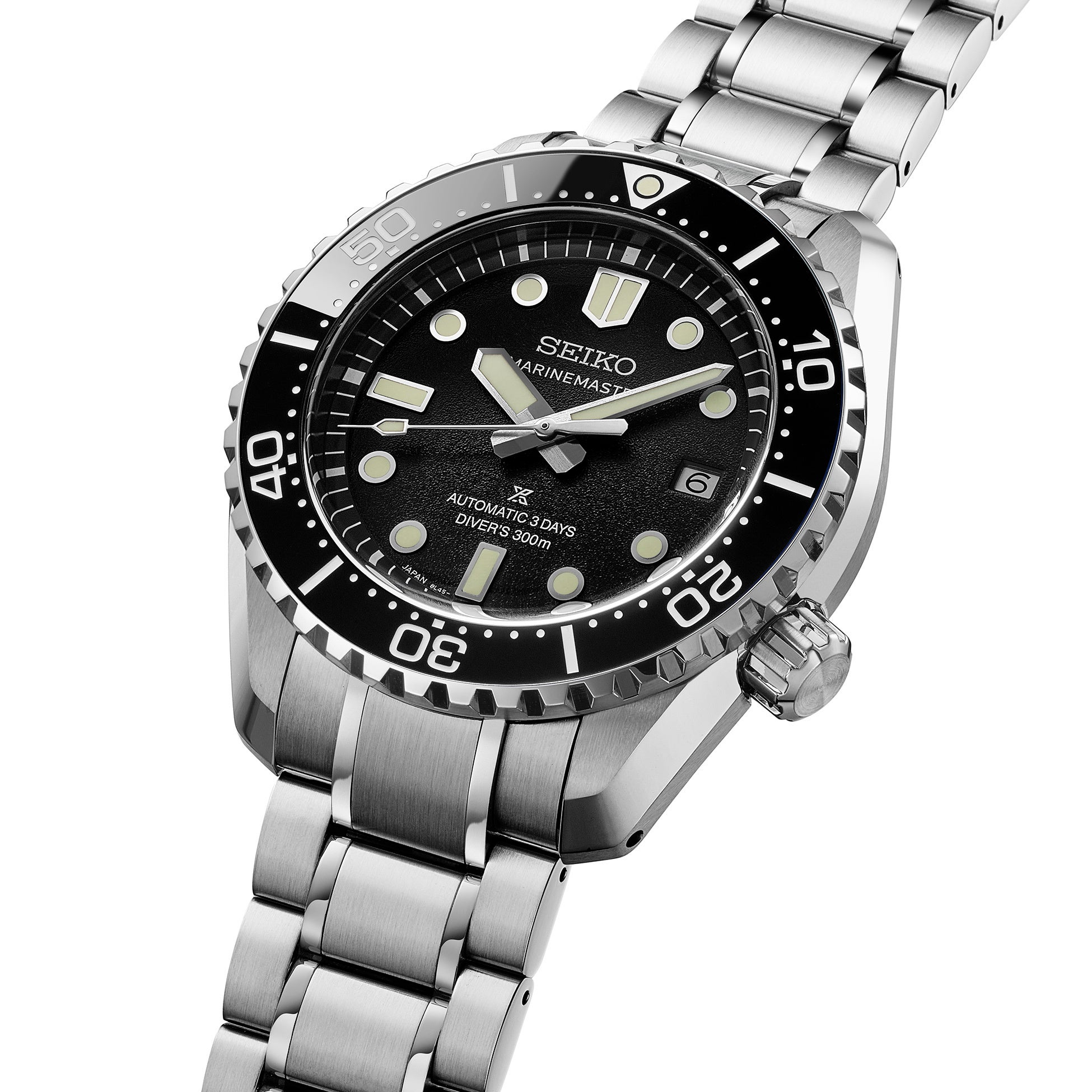 本作は、マリンマスターとしてキャリバー8L45を搭載した初のレギュラーモデルとなります。ダイヤルは、梨地仕上げと今までよりも深い黒の塗装により、高い視認性を実現しました。また、高輝度ルミブライトにより水中や暗所での視認性も追求しています。コラボレーション限定モデルと同様に、ベゼル表示板にはセラミックス素材を採用しています。
