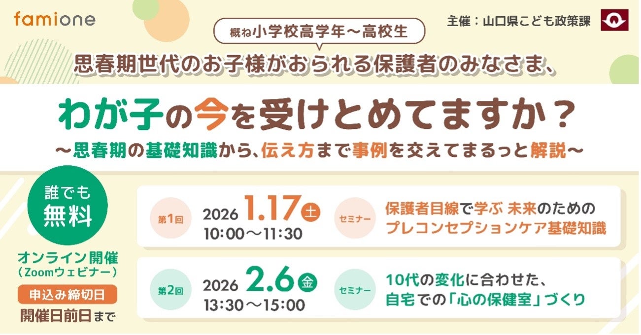 「子どもを願うすべての人によりそい 幸せな人生を歩める社会をつくる」をビジョンに掲げ、法人の従業員向け福利厚生や自治体の住民向け支援を行うヘルスケアサポートサービス「ファミワン」 https://famione.com/benefit/ などを展開する株式会社ファミワン(本社:東京都渋谷区、代表取締役:石川勇介)は、山口県(知事:村岡 嗣政、以下 山口県)より委託を受け、保護者向け思春期セミナー『「わが子の今を受けとめていますか?」~思春期の基礎知識から、伝え方まで事例を交えてまるっと解説~』を2026年1月17日(土)・2月6日(金)の2日間でオンライン開催いたします。