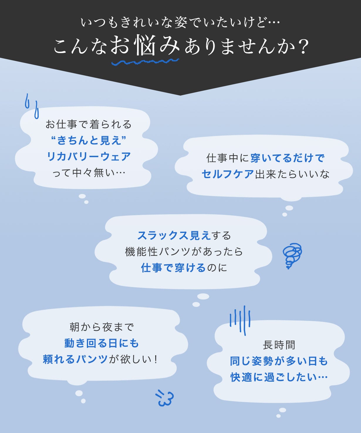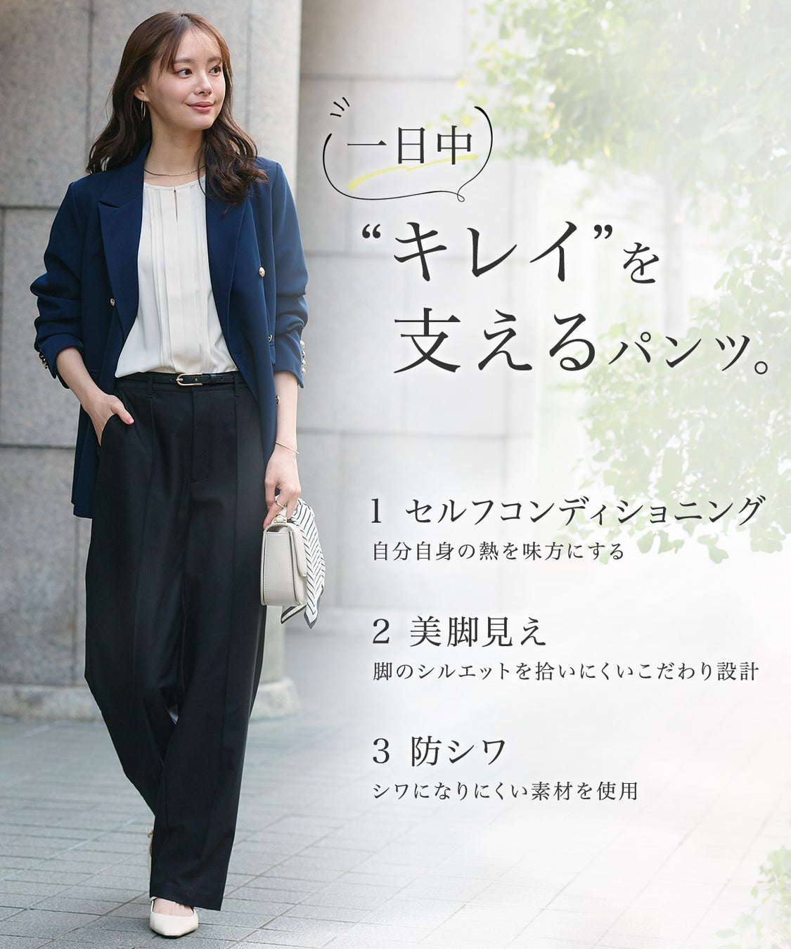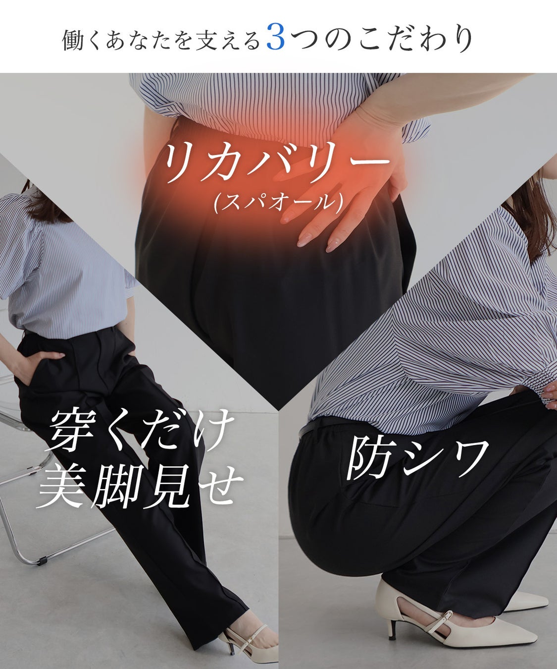 「穿いているだけでセルフケア」を当たり前に。 一日中キレイでいたい、でも楽に過ごしたい。「きちんと感」も決して妥協したくない。 そんな欲張りな願いを叶え、どんな日も自分らしくいられるように。 私たちは、この“新しいお仕事パンツ”を届けます。