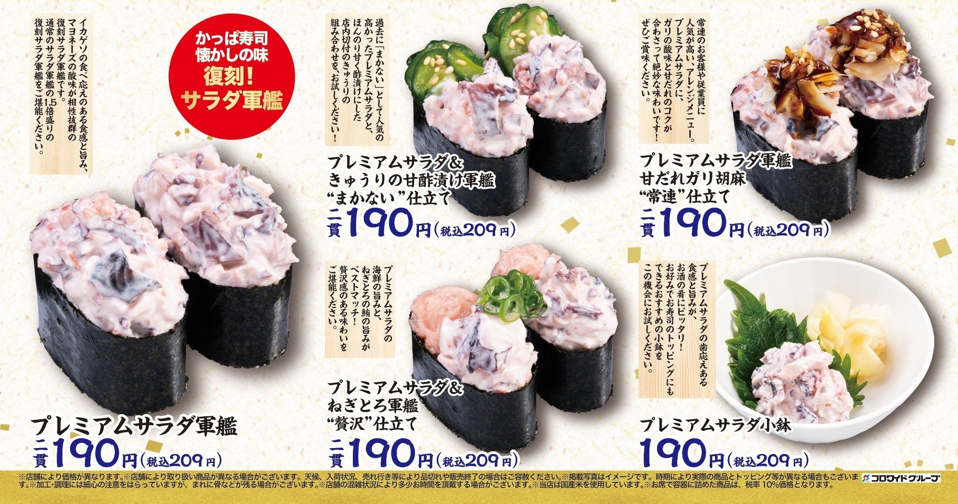 『プレミアムサラダ』は、ボイルイカの食べ応えある食感やマヨネーズのまろやかな酸味、あと引くイカの旨みなどが1980年代の味わいを思い起こさせます。また、かっぱ寿司の常連のお客様と長年かっぱ寿司で働く従業員が楽しむアレンジ、様々なネタと組み合わせて商品として提供されていた時代のものをアレンジするなどしてご用意いたしました。