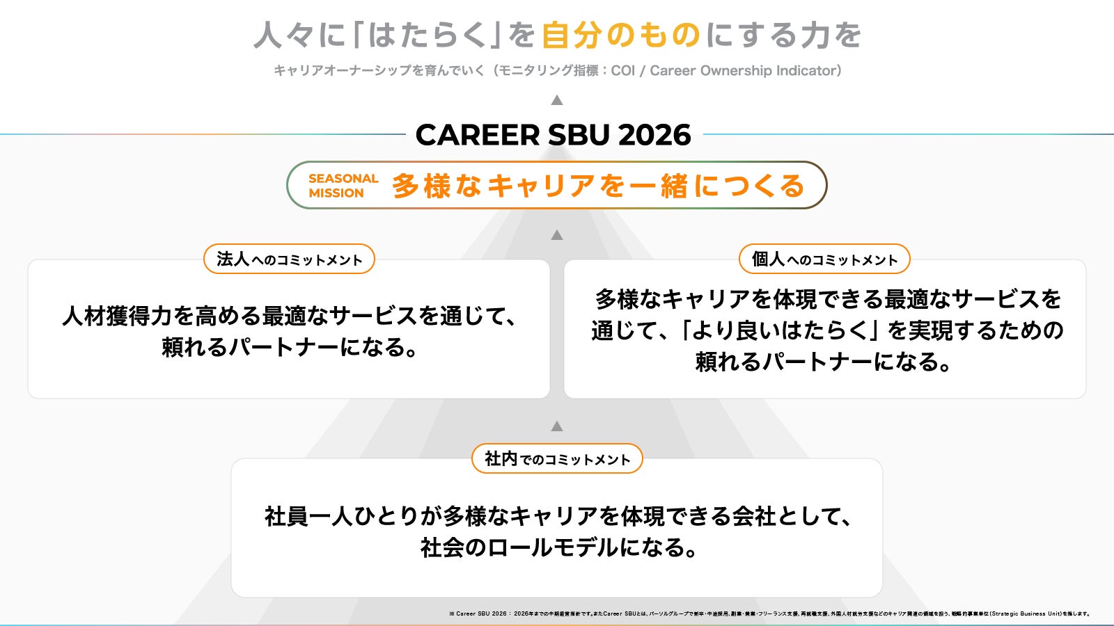 「Career SBU 2026」は、当社が掲げるミッションの実行力を高めるべく、2026年3月までに目指したいSeasonal Mission「多様なキャリアを一緒につくる」を策定し、「個人のお客さま」「法人のお客さま」、また、お客さまへ価値を提供していくにあたっての「社内」、という3つの領域に向けたコミットメントを設定したものです。