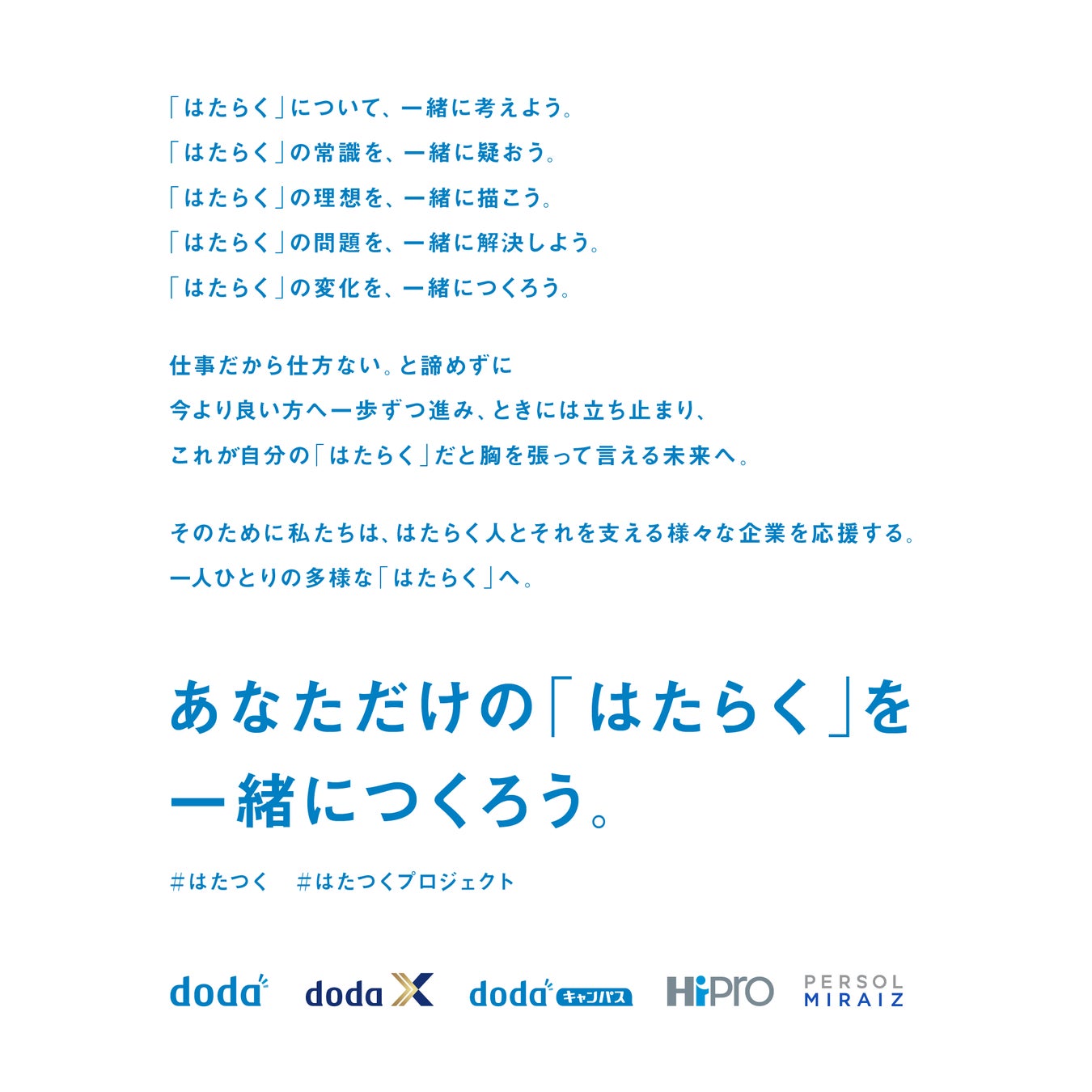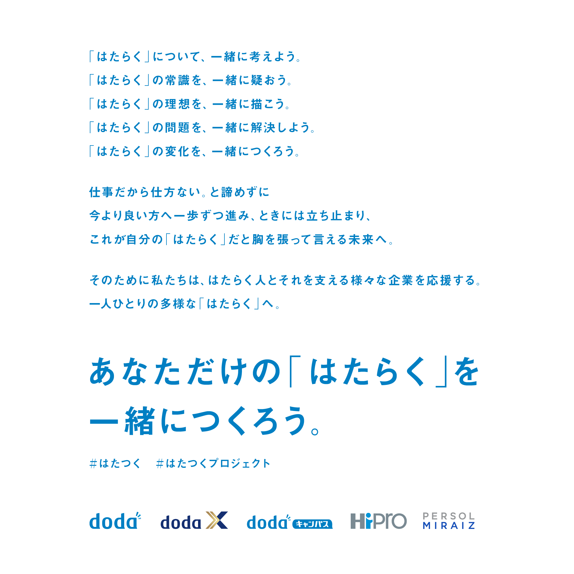 当社は、企業、メディア、団体のみなさまととも「はたらく」について考え、取り組んでいきたいと考えており、はたつくプロジェクトに賛同くださる企業、メディア、団体を募集しております。ご興味のある方は、特設サイトの問い合わせフォームより、お気軽にご連絡ください。