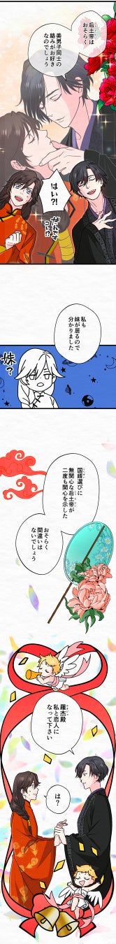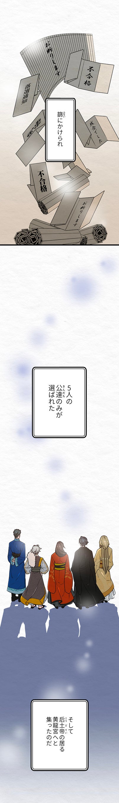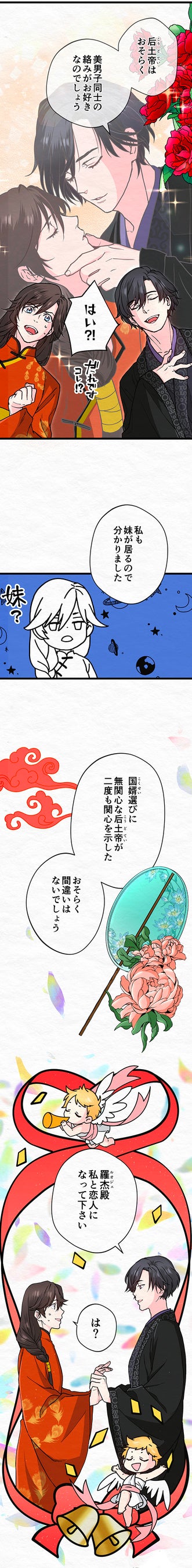 代々女帝が治める豊かな国「応国」。夫に先立たれた后土帝の再婚相手を見つけるため、国内外から5人の若き婿候補の公達が選ばれた。互いに女帝の夫の座を狙いアピールしていく、壮大な婚活パーティー物語…のはずがーー。女帝が男同士の絡みに興味を示すことに気が付いたハオランは、手近な公達・ルオジェと手を組むことに。2人でビジネスBLにいそしむ中、徐々にお互いを意識し始め…?