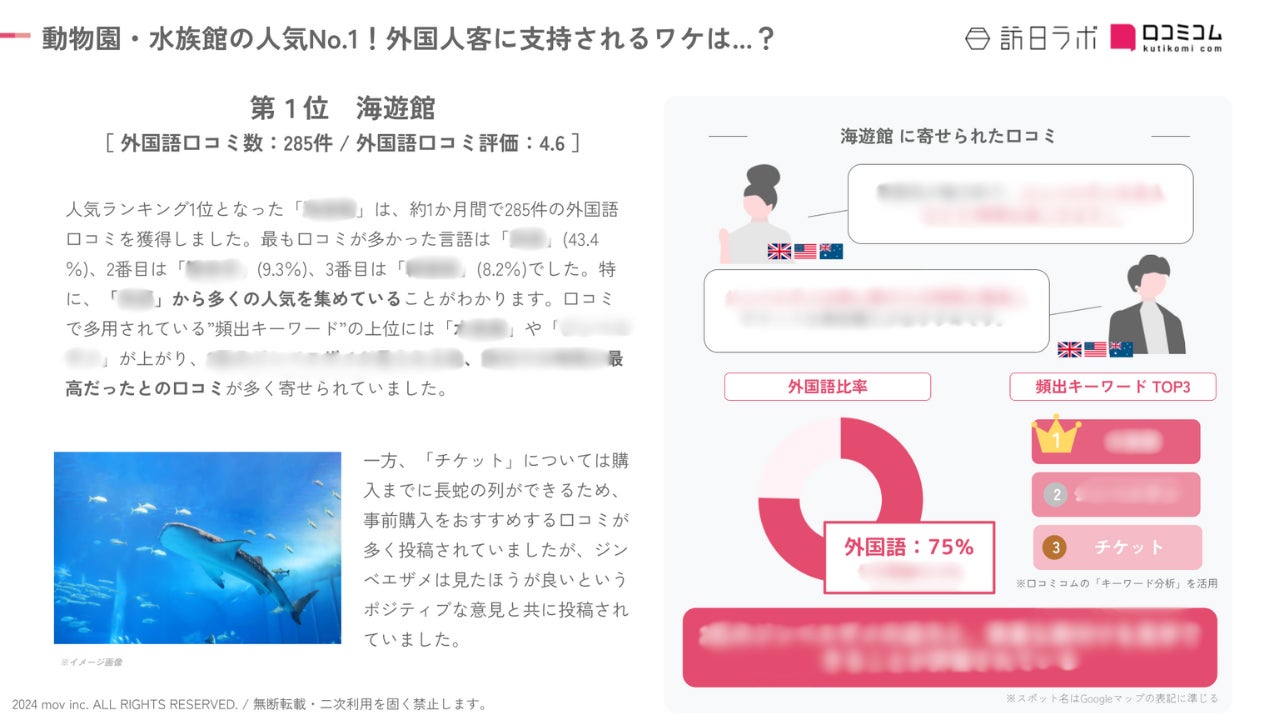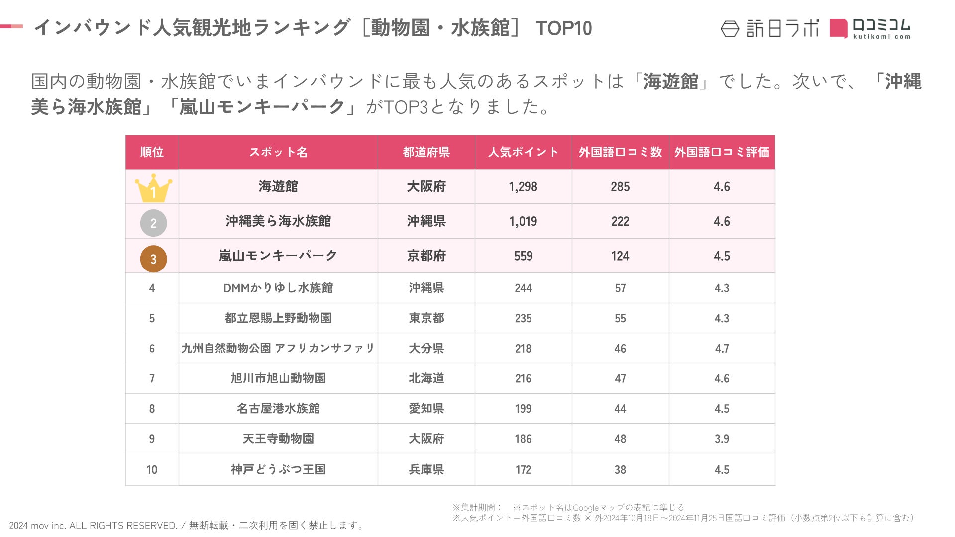 業界最大級のインバウンドビジネスメディア「訪日ラボ」及び 店舗向け集客一元化プラットフォーム「口コミコム」を運営する株式会社mov(代表取締役:渡邊 誠、本社:東京都渋谷区、以下mov)は、国内動物園・水族館に寄せられた最新の口コミデータから、独自の『インバウンド人気観光地ランキング』を発表しました。
