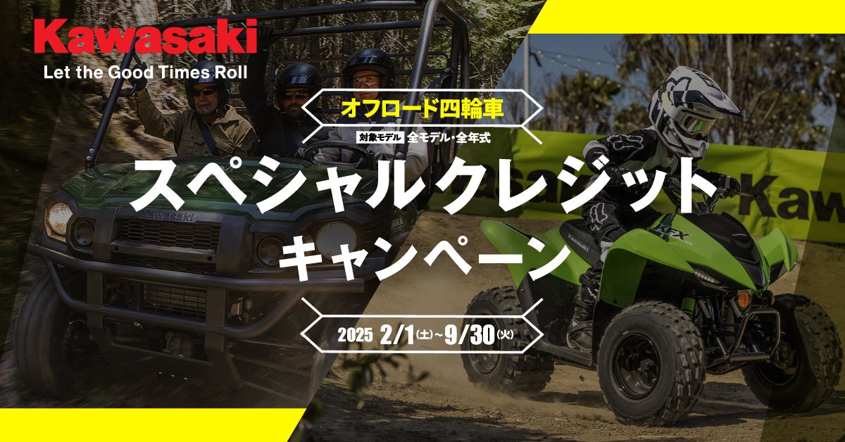 株式会社カワサキモータースジャパン(本社:兵庫県明石市、代表取締役社長:佐伯 健児)は、全国のカワサキ正規取扱店(オフロード四輪取扱店/ATV取扱店)にて、カワサキのオフロード四輪車(SxS/ATV)新車ご購入時に、実質年利1.9%でご利用いただける「オフロード四輪車スペシャルクレジットキャンペーン」を2025年2月1日(土)より実施。