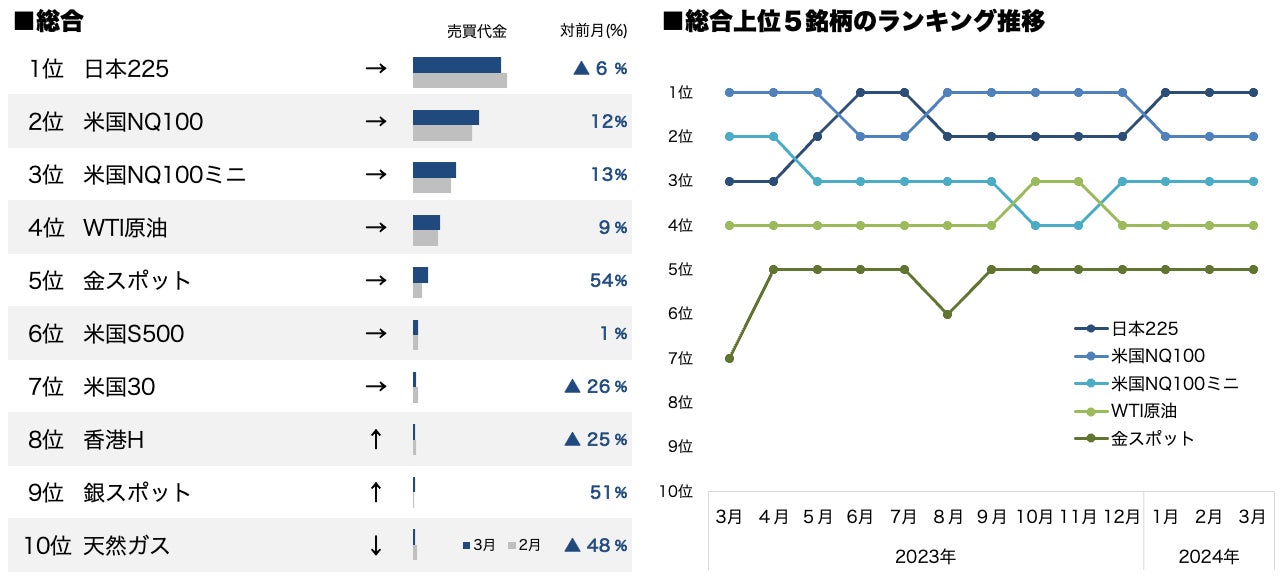 2024年3月は、日経平均株価が終値で史上初の4万円台をつけるなど大きく上昇したことから、「日本225」が3ヶ月連続で総合ランキングの首位となりました。外国株CFDランキングにおいては、米国半導体大手「NVIDIA」が2月に続き首位となったものの、ビットコイン価格の上昇を背景に株価が急上昇した「マイクロストラテジー」の売買代金が大きく伸長し、首位と僅差で2位にランクインしました。