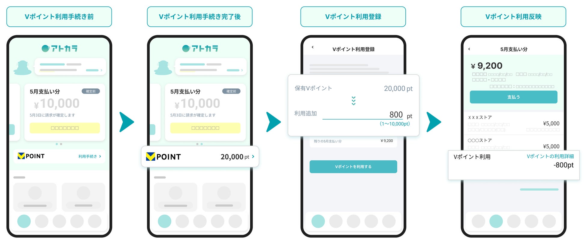 「アトカラ」のお支払いに、Vポイントを1ポイント=1円分としてご利用いただけます。