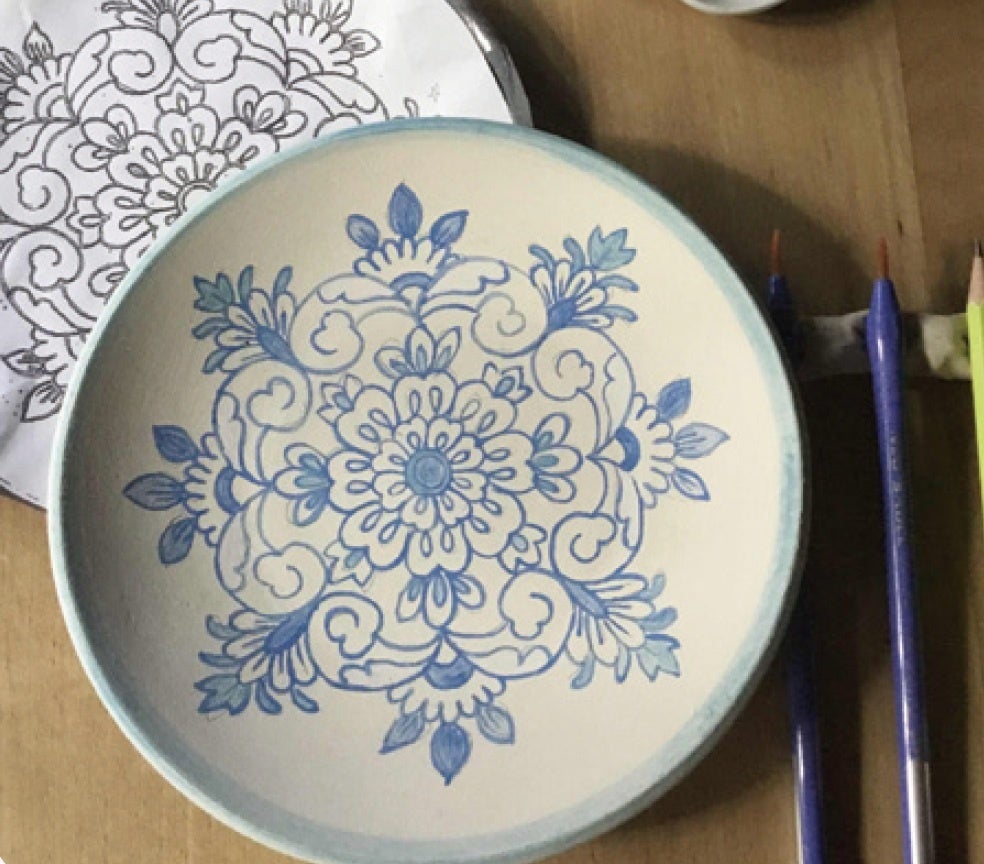 ◼︎正倉院文様皿(密陀絵皮箱)の絵付け体験|食器として使える美しいお皿の絵付けをしませんか。下絵の文様を素焼きのお皿に描き写し陶芸用顔料で絵付けをした後、一旦お預かりして釉薬を掛けて焼き上げます。(送料は別途要)