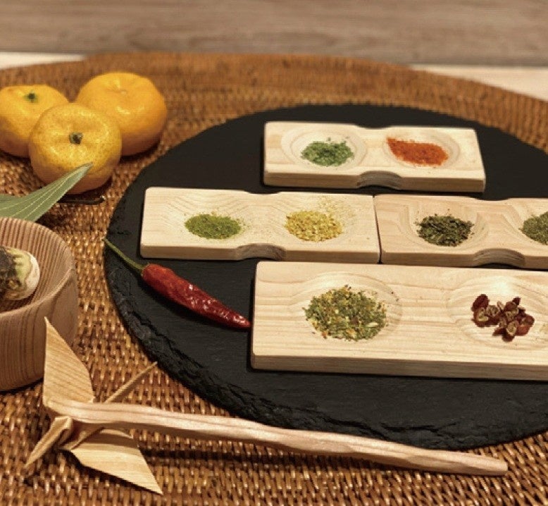■大和七味づくり体験|奈良県産の薬草を十種以上ブレンドし、職人が手づくりした吉野杉のすり鉢で香りを立てながらすり合わせます。香りと辛さを調整し、自分だけの七味を作る体験です。完成した七味はお持ち帰りいただけます。