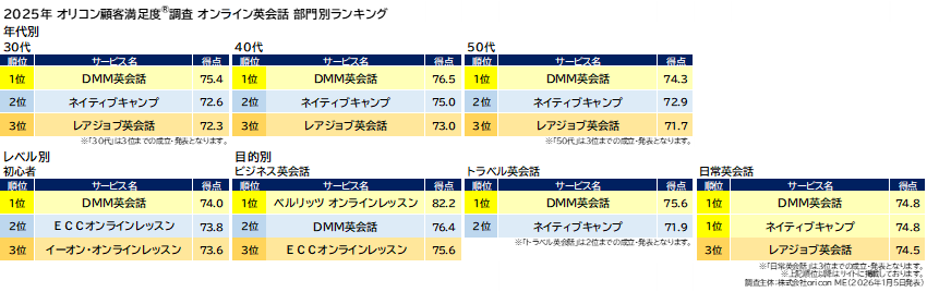 2013年より発表している『オンライン英会話』ランキング。13回目となる今回は、【DMM英会話】が2年連続3度目の総合1位となりました(2017年、2025~2026年)。