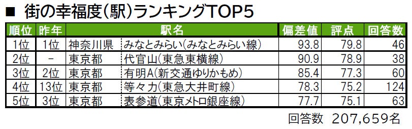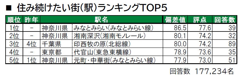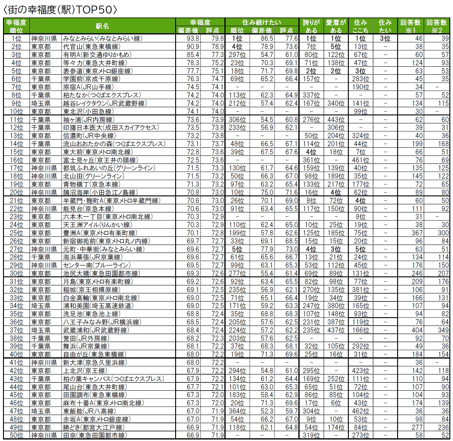 1位は、「街の幸福度(駅)」でも1位のみなとみらい、2位は湘南深沢です。トップ2の駅はいずれも神奈川県に位置する駅で、昨年は累計回答数が30名未満だったためランキング集計対象外でした。3位は印西牧の原で、千葉県にある駅からのランクインです。