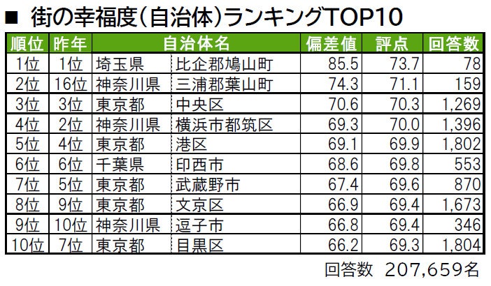 1位は2年連続で埼玉県比企郡鳩山町で、トップ10内では唯一埼玉県からランクインしています。2位は神奈川県三浦郡葉山町で、「街に誇りがある(自治体)」「街に愛着がある(自治体)」の両ランキングでは1位です。3位は東京都中央区で、「住みここち(自治体)<首都圏版>」では1位の評価を得ています。