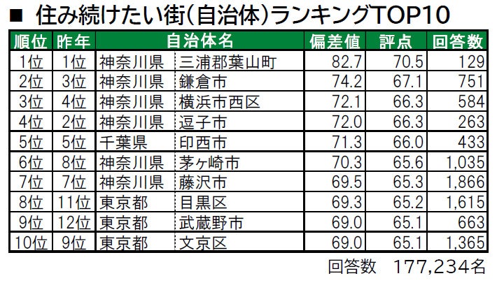 ■住み続けたい街(自治体)トップは、2年連続で神奈川県三浦郡葉山町