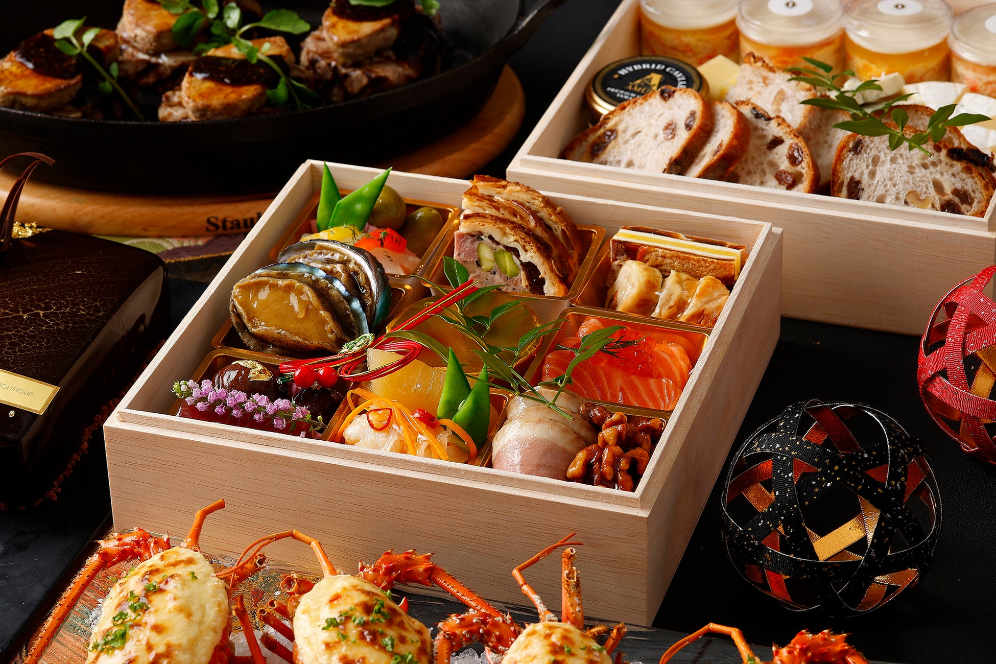 [壱ノ重(和ノ重)] 伊勢海老の味噌マヨネーズ和え、タコ照り焼き、イカの旨煮、数の子、柿とバターのミルフィーユ、伊達巻き、栗金団、笹大福、からす鰈味噌焼き、黒豆、にしん小巻き、紅白蒲鉾、からすみ、カスタードオーロラ