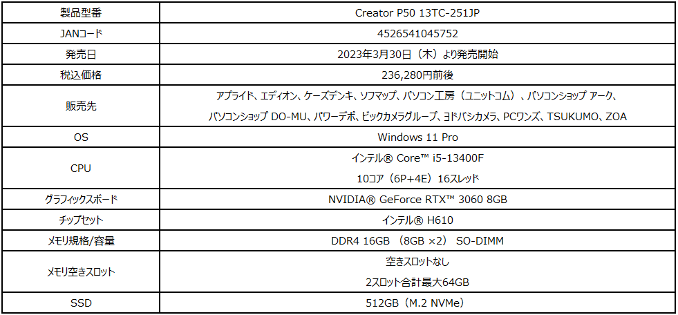 フルHDコンテンツ制作に特化したコンパクトなクリエイターデスクトップPC 第13世代インテル® Core™ i5搭載 「Creator P50 13TC-251JP」発売