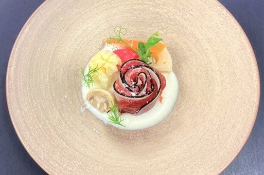 野菜とバラの花に見立てたマグロ、ソースの白色が、那須の秋から冬へと変わっていく季節の移ろいを表現した一皿です。