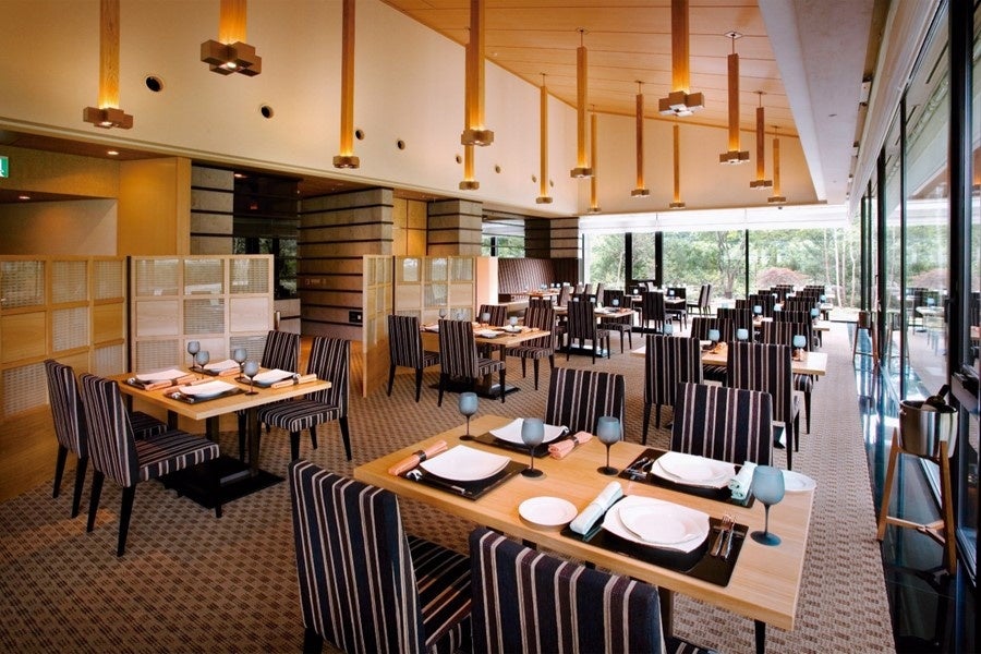 大きな窓が印象的な木立に囲まれるように建つコーススタイルのレストラン。