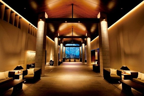 穏やかな傾斜地を囲むように低層階の建物が配置され、客室からは季節の移ろいを感じられる自然が眺められます。ホテルのロビーに一歩足を踏み入れると、神殿のような落ち着いた雰囲気が漂い、フロント後方の大きな窓から見える景色も美しく、心地よい休息の始まりを実感していただけます。