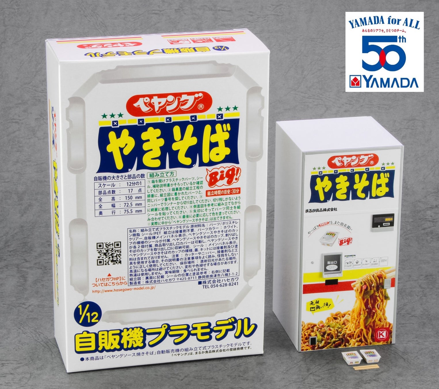 ともに群馬県に本社を置くヤマダデンキと「ペヤングソースやきそば」のまるか食品が夢のコラボレーション!ヤマダデンキ創業 50 周年記念限定商品として、話題の1/12レトロ自販機プラモデルに「ペヤングソースやきそば自販機」が登場しました。
