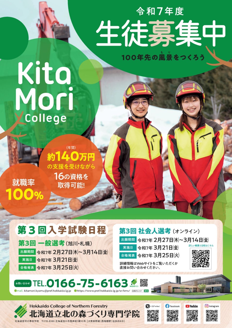 北海道立北の森づくり専門学院(略称:北森カレッジ)では、北海道の森林づくりへの意欲に溢れた多様な人材を、広く募集するため、第3回一般入学試験を実施します。試験は、新卒者等を対象とした「一般選考」のほか、職務経験が5年以上の社会人を対象としたオンライン面接による「社会人選考」となっています。