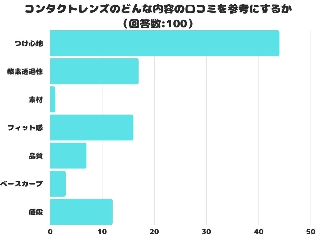 コンタクトレンズのどんな内容の口コミを参考にするかをアンケートにて調査したところ、1位は「つけ心地」でした。