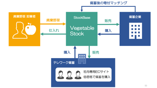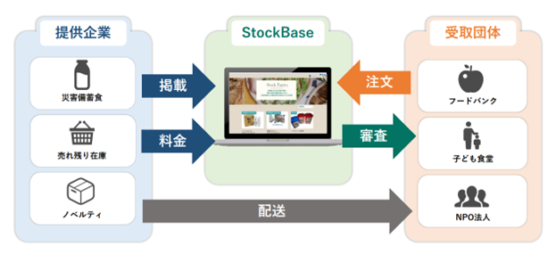 ●栄養のある災害備蓄品を企業に販売し、備蓄後に一定期間が過ぎた場合は、既存事業である企業向けの物品活用プラットフォーム「StockBase」を通じて寄付マッチング