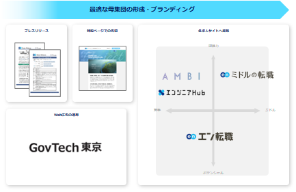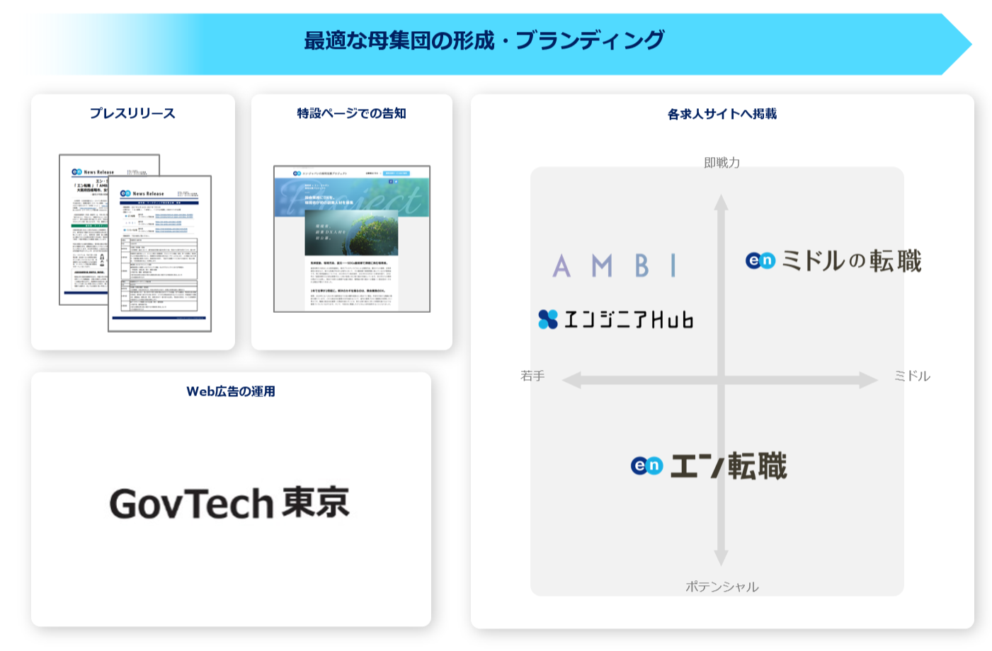 プレスリリースや特設ページ、Web広告での告知に加え、各求人サイトでの集客支援を行ないます。『エン転職』『AMBI』『ミドルの転職』『エンジニアHub』とターゲットの異なる4つの求人サイトを活用することで、ターゲットへ網羅的に求人を届けます。