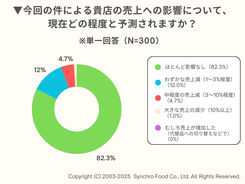 次に、今回の件による、自店の売上への影響予測についても聞いたところ、「ほとんど影響なし」が82.3%と大半を占め、直接的な売上減への懸念は限定的であることがわかりました。